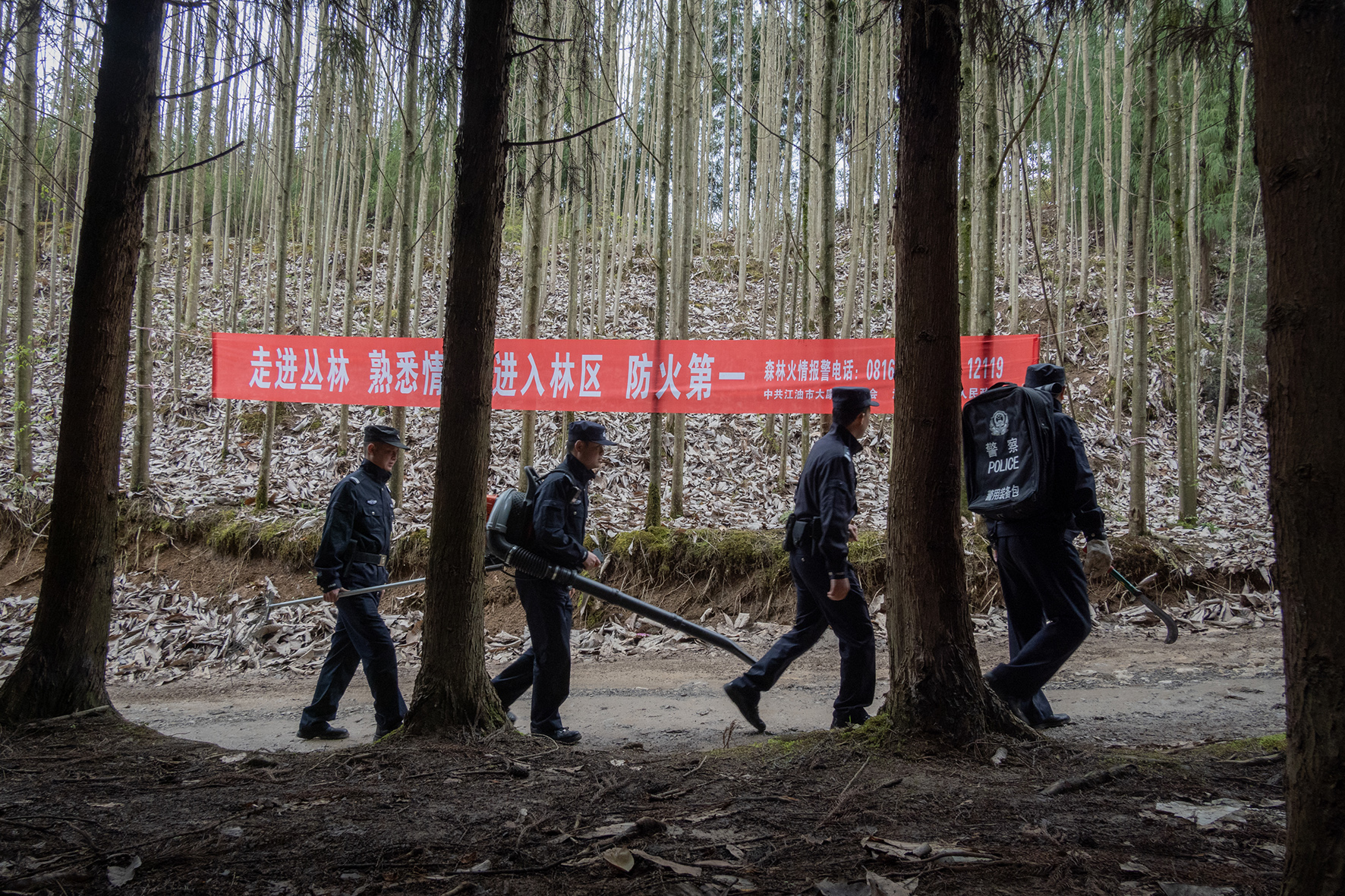 圖為4月7日,巡邏隊(duì)員在巡山護(hù)林,并向游客和村民講解防火知識(shí)。