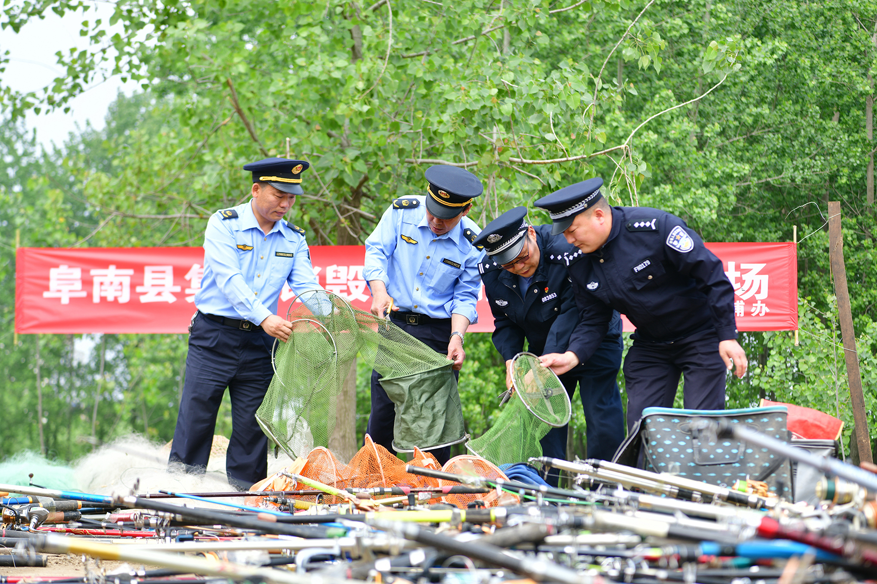 4月23日,安徽省阜南縣公安森林民警和農業(yè)執(zhí)法人員在淮河流域曹集鎮(zhèn)集中銷毀一批違法捕撈漁具。