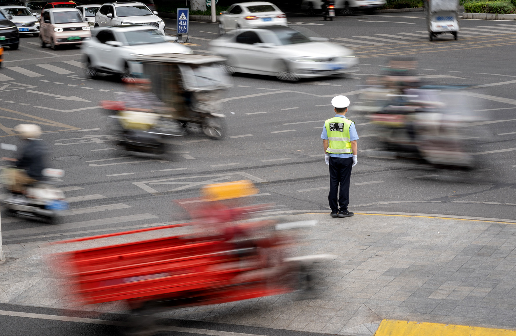 5月1日,四川省綿陽市公安局交警支隊(duì)民警在涪城區(qū)東方紅大橋十字路口執(zhí)勤疏導(dǎo)交通。