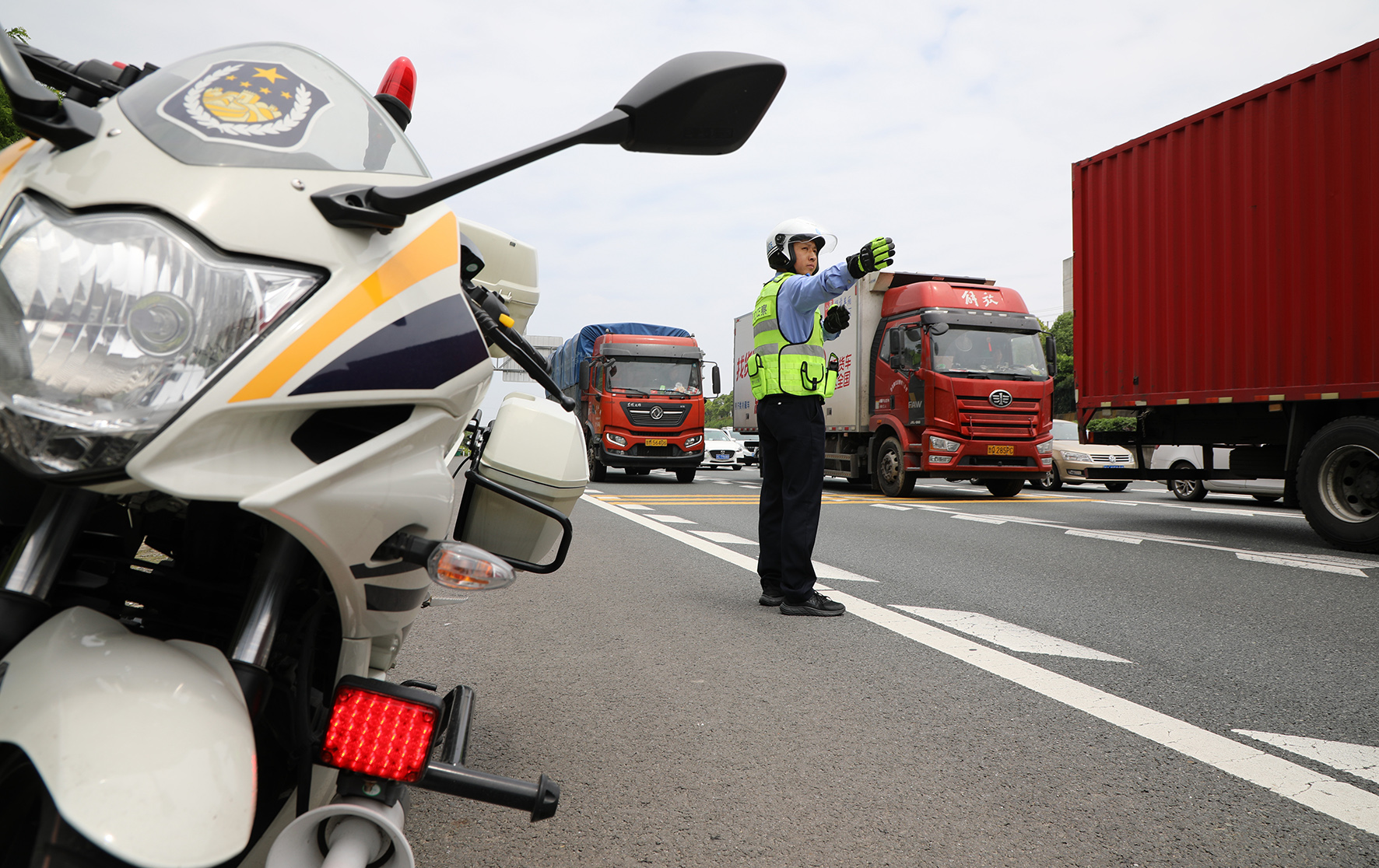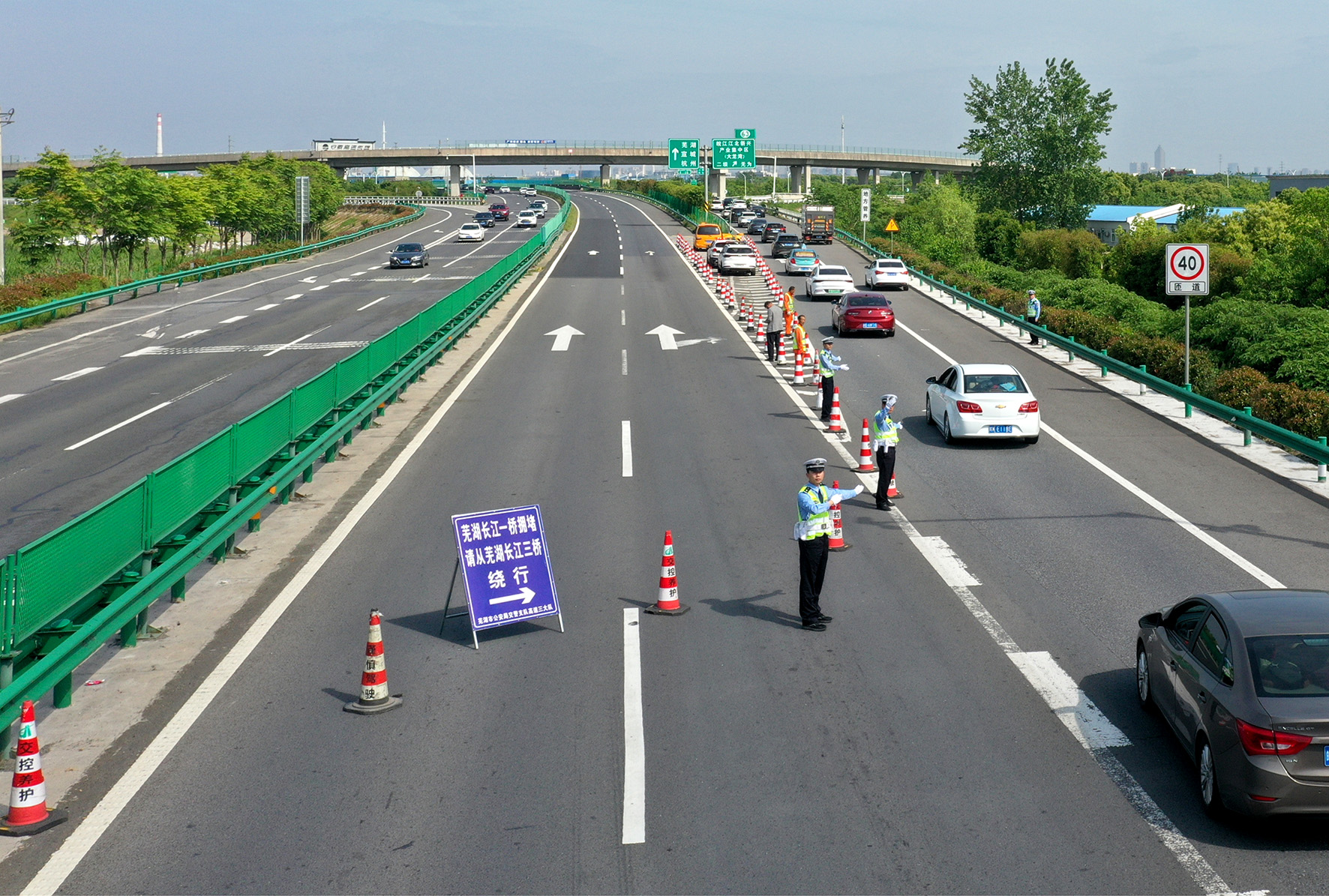 5月1日,安徽省蕪湖市公安局交警支隊(duì)三大隊(duì)民警在合蕪高速公路蕪湖段二壩樞紐對擁堵車流進(jìn)行分流,確保蕪湖長江大橋車輛通行暢通有序。