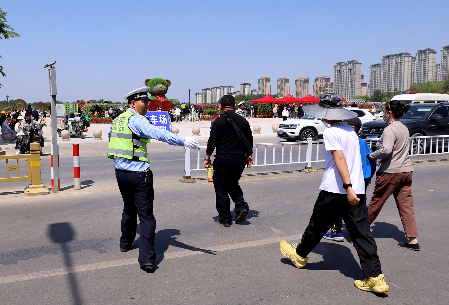 5月1日,山東省棗莊市公安局市中分局交通警察大隊(duì)民警在一處景點(diǎn)出入口疏導(dǎo)交通。