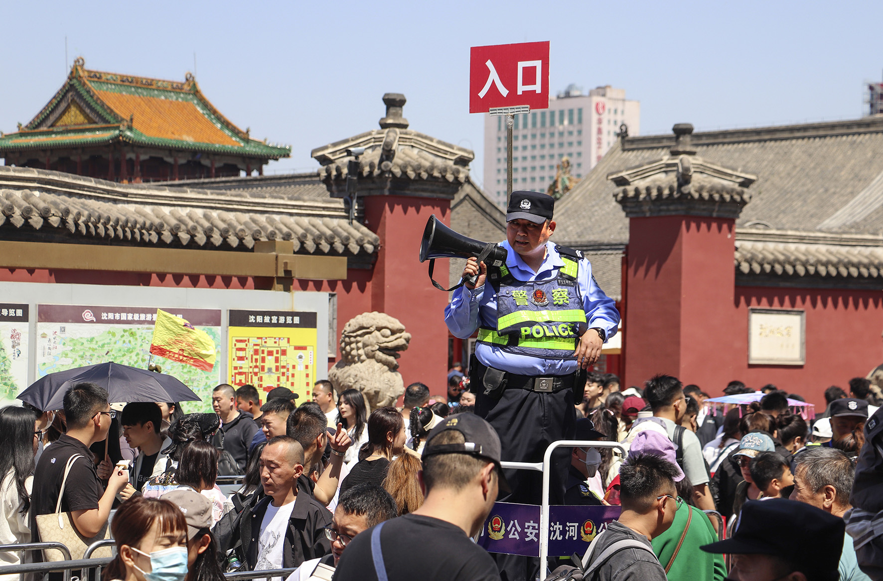 5月1日,遼寧省沈陽市公安局沈河分局民警在沈陽故宮執(zhí)勤崗維護(hù)秩序。