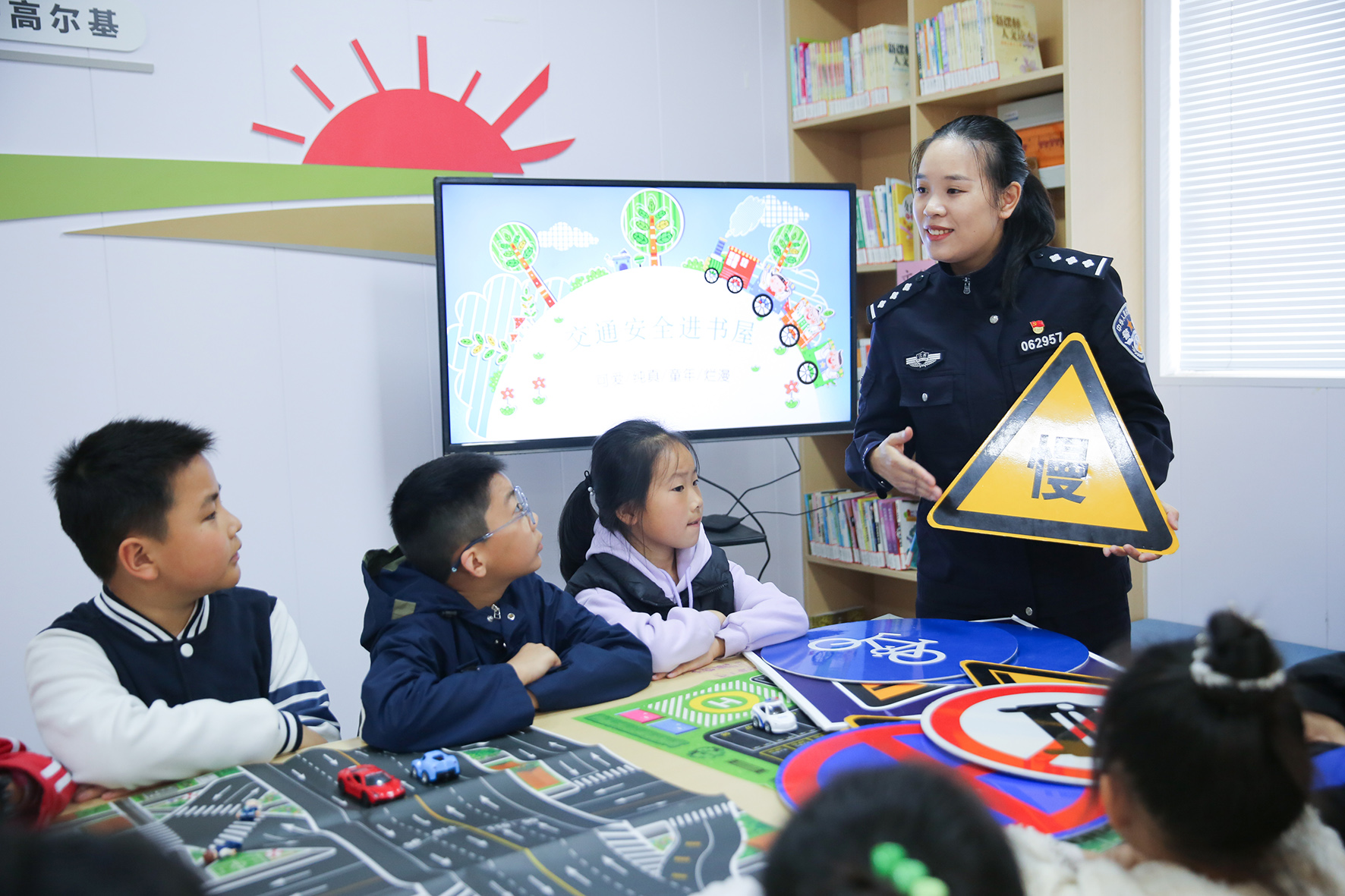 5月5日,江蘇省如皋市城南街道馬塘社區(qū)農(nóng)家書屋假期交通安全課堂上,高新區(qū)交警中隊(duì)民警向?qū)W生交通安全知識普及。