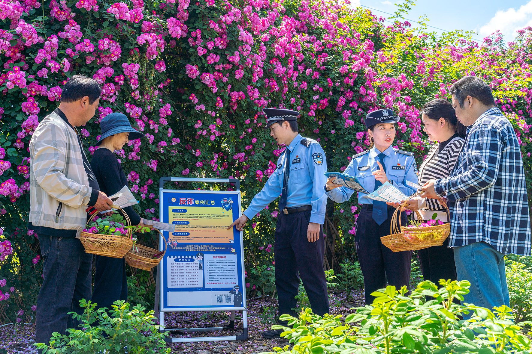 5月8日,上海市公安局崇明分局綠華派出所民警來到轄區(qū)農(nóng)莊,向正在采摘花瓣的員工們開展電信詐騙防范宣傳。