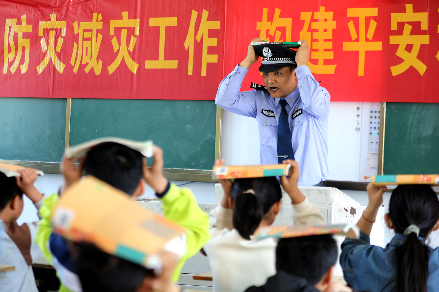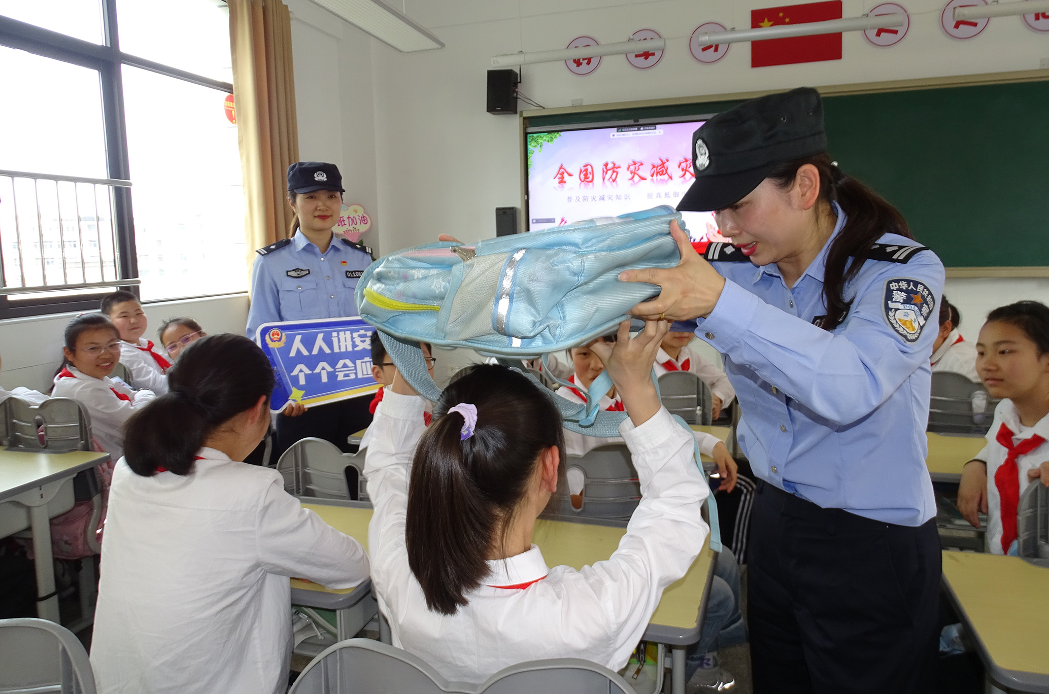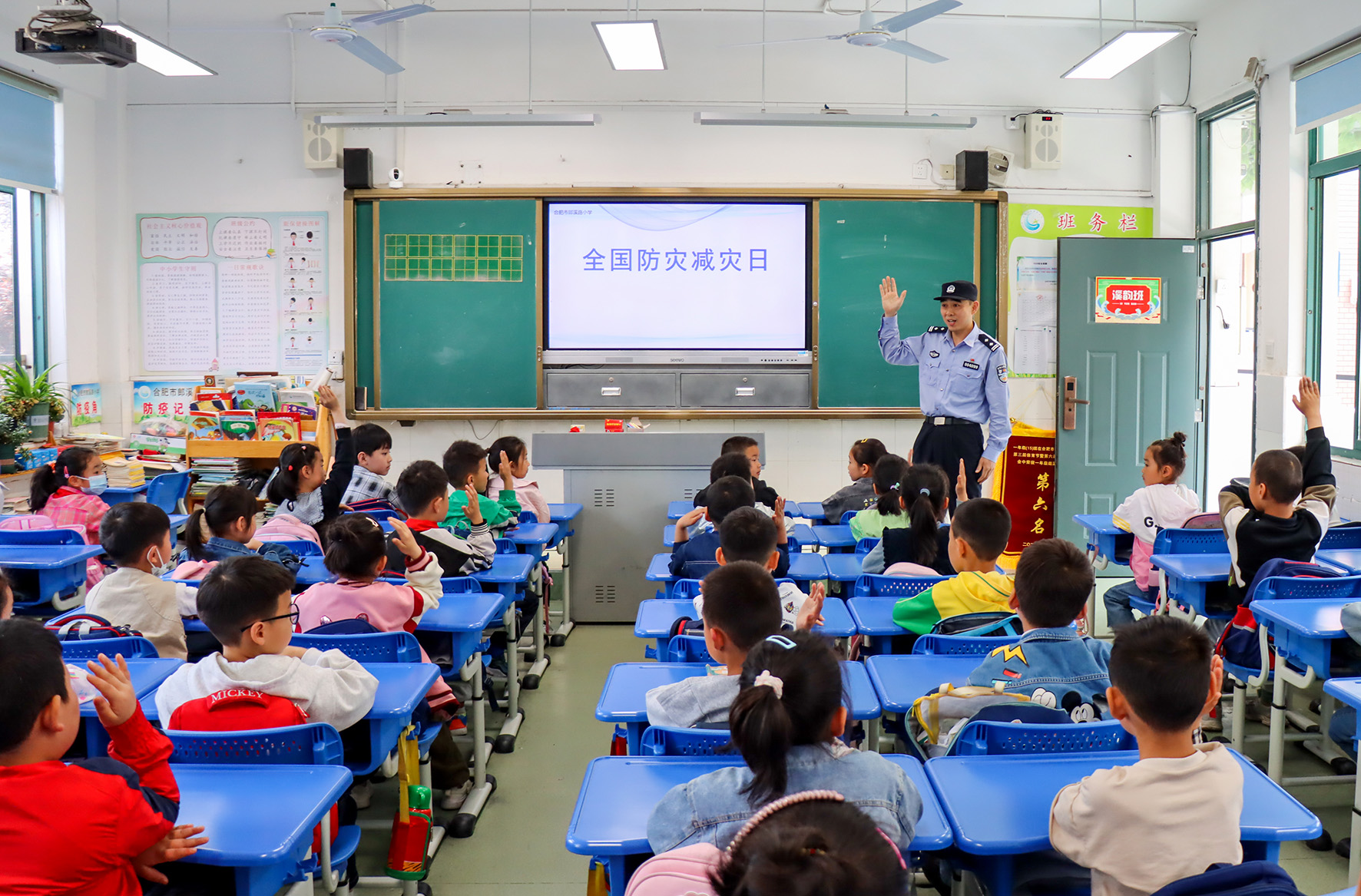 5月10日,安徽省舒城縣公安局闕店派出所民警在課堂上向?qū)W生講解防災(zāi)減災(zāi)相關(guān)知識。