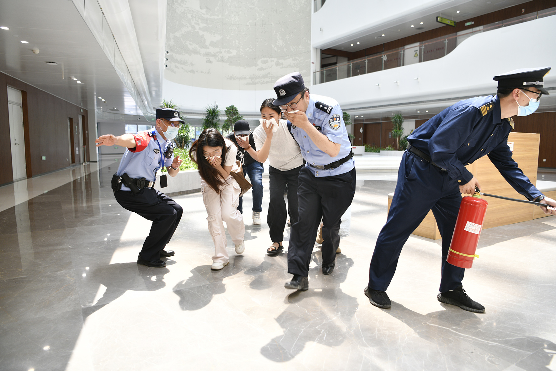 5月9日,河南省鄭州市公安局金水分局巡特警隊(duì)員在轄區(qū)大型圖書館開展自然災(zāi)害應(yīng)急處置救援演練。