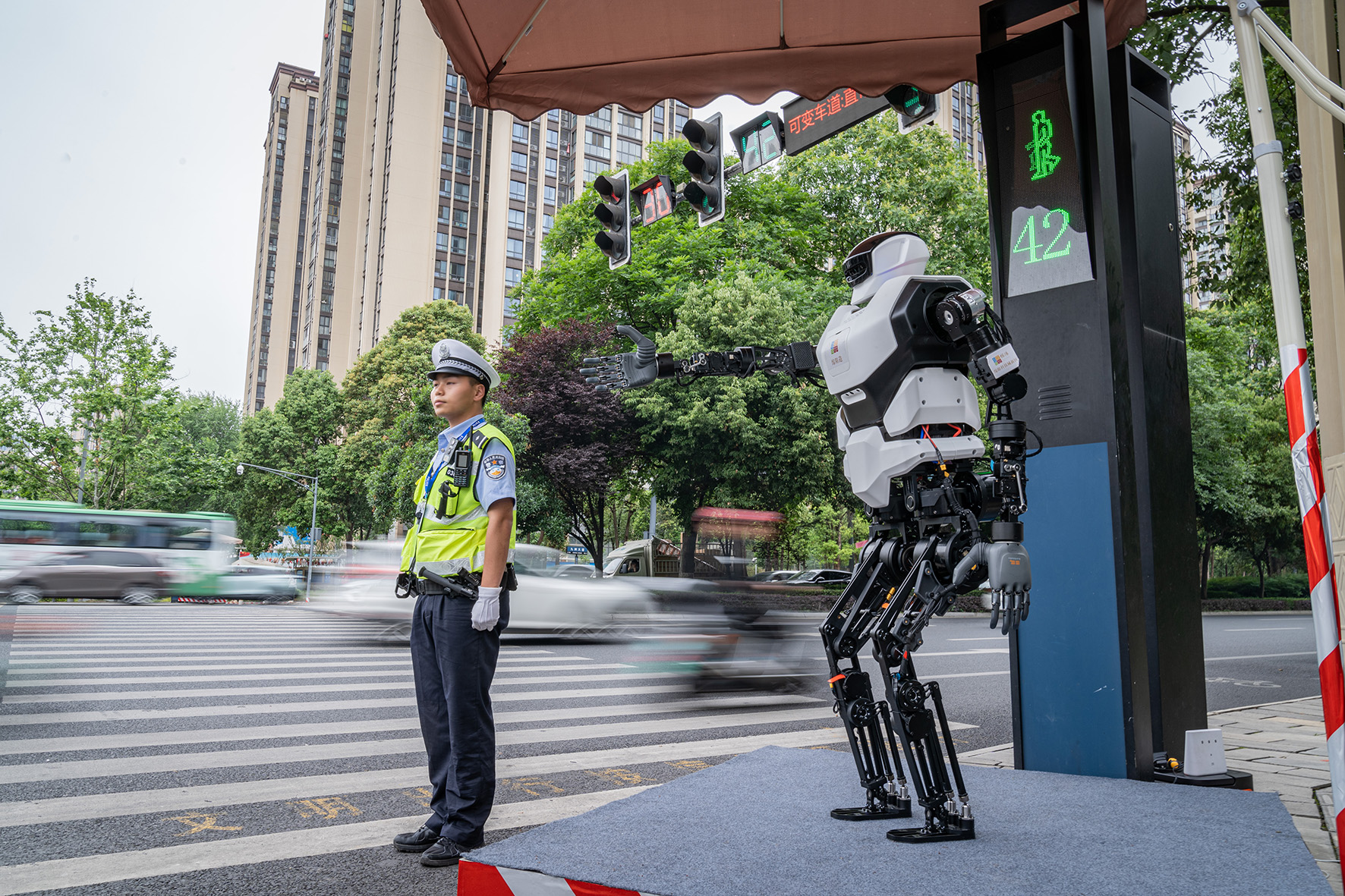 圖為5月11日,“綿陽造”人形機器人在四川省綿陽市科技城新區(qū)九洲大道與園藝街交叉路口,作為文明交通勸導“志愿者”配合民警開展工作。