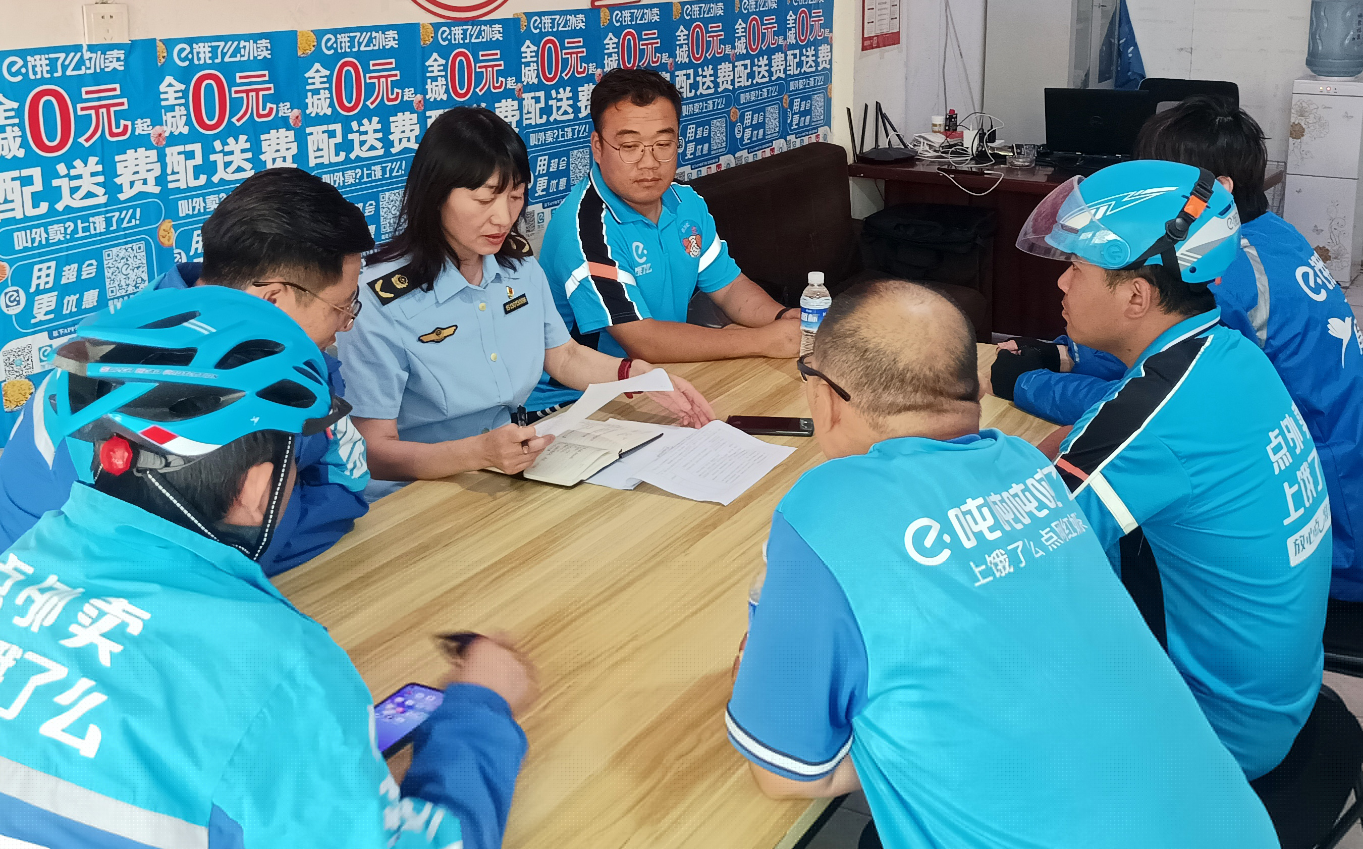 圖為檢查人員對配送員進行安全教育培訓(xùn)。