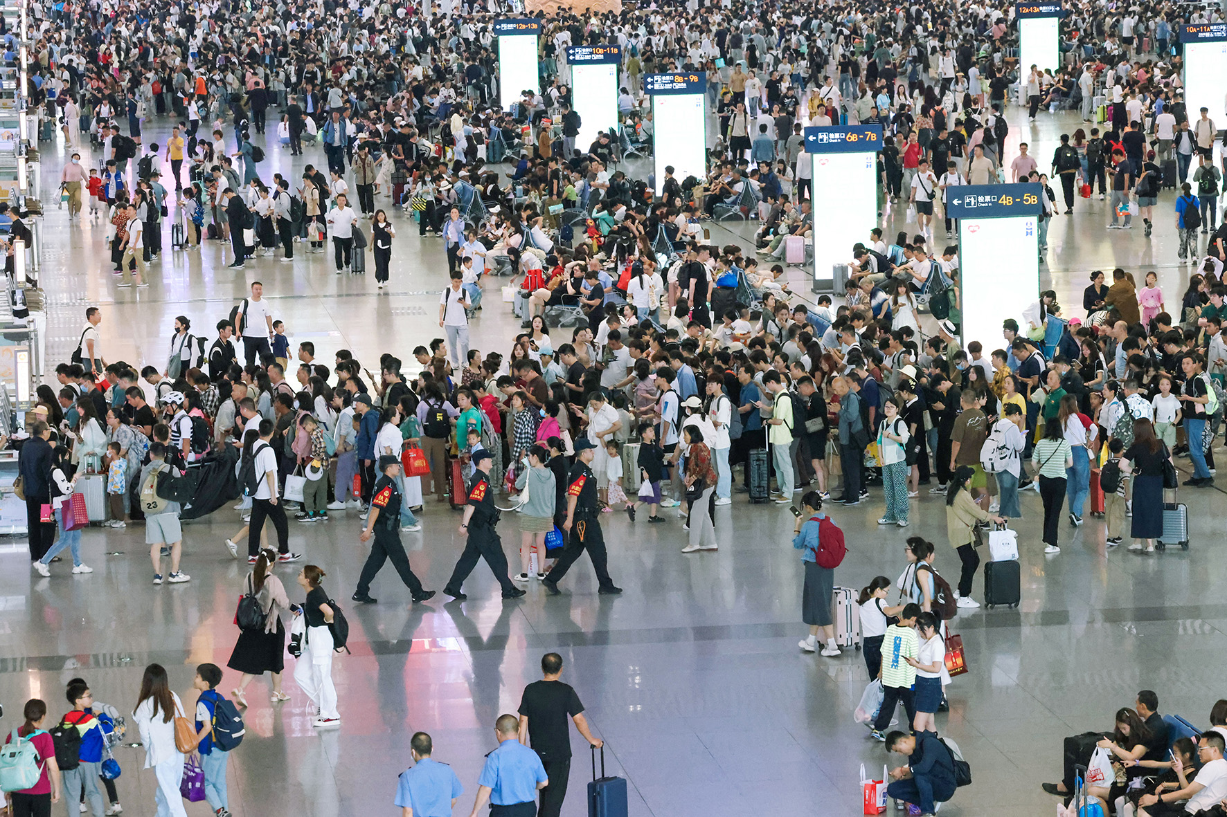 6月8日,在西安北站候車室,西安鐵路公安處特警支隊(duì)民警在候車室里執(zhí)勤巡邏。