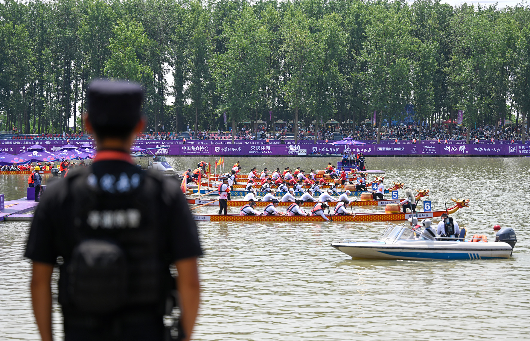 6月9日,江蘇省鹽城市公安局亭湖分局巡特警在2024年中華龍舟大賽現(xiàn)場(chǎng)執(zhí)勤。
