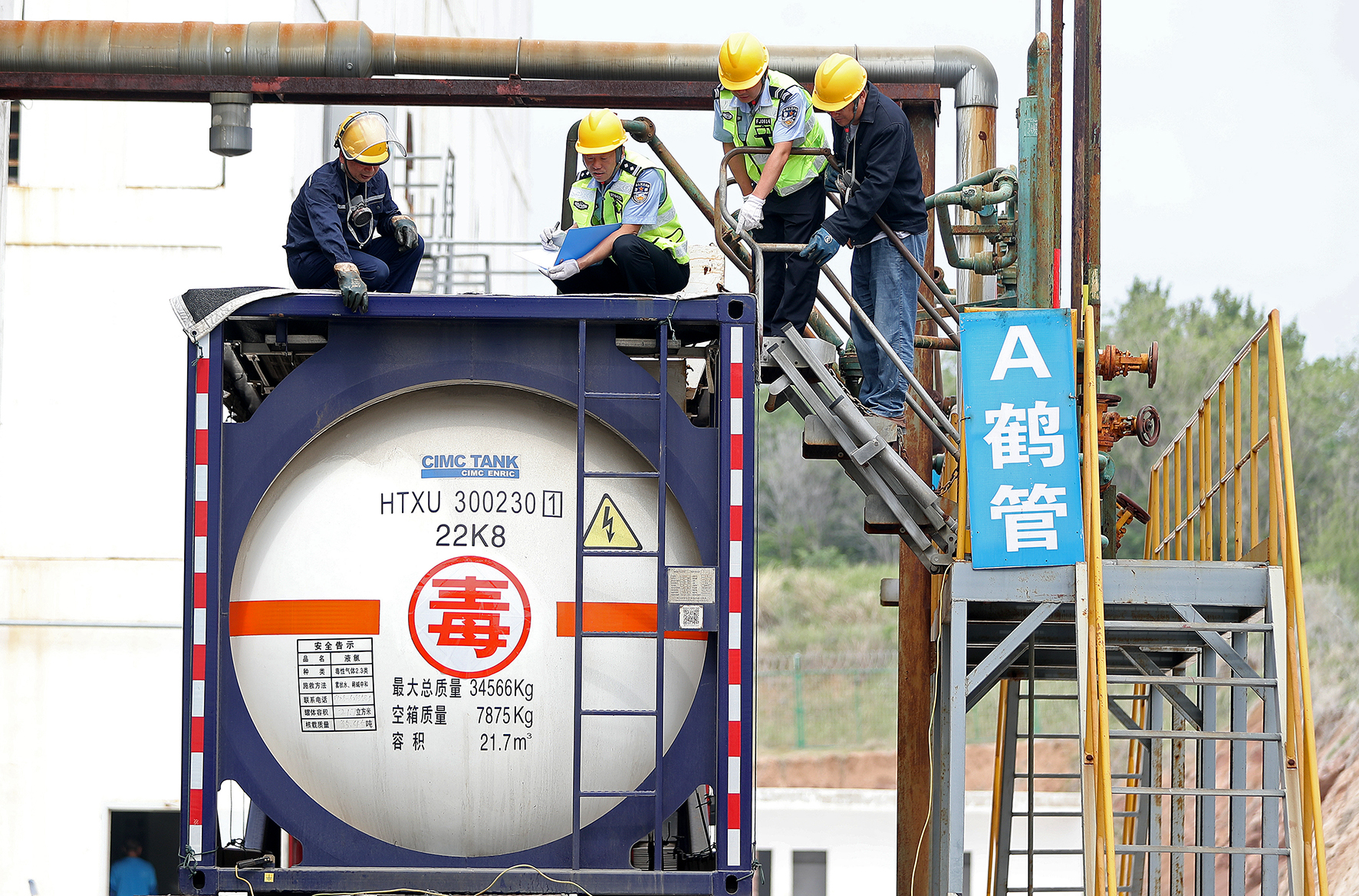 6月13日,湖北省荊門市交警支隊民警在危化品運輸企業(yè),實地抽查車輛警示標(biāo)識標(biāo)志等安全設(shè)施,排查?;愤\輸車輛安全隱患。