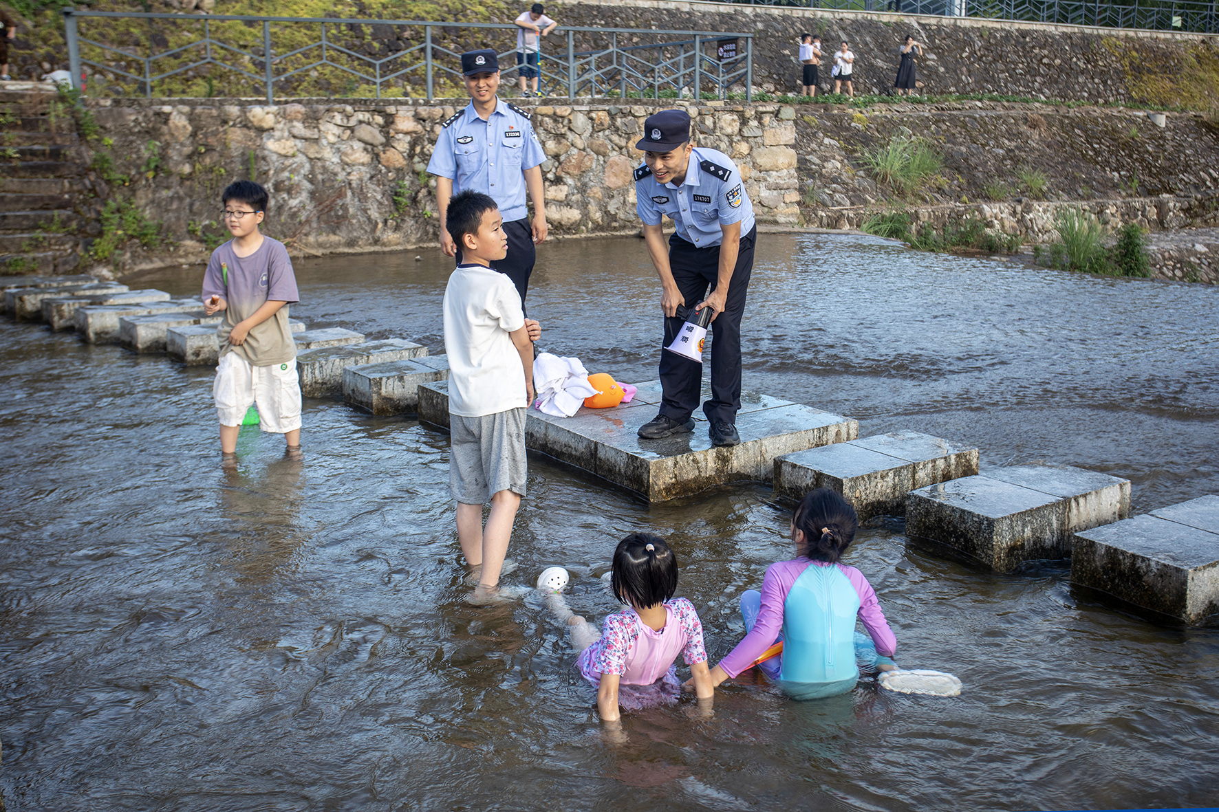 7月8日傍晚,浙江省臺州市公安局寧溪派出所民警在嶼頭鄉(xiāng)柔極溪開展防溺水巡查勸導,對戲水的小朋友開展防溺水安全教育。