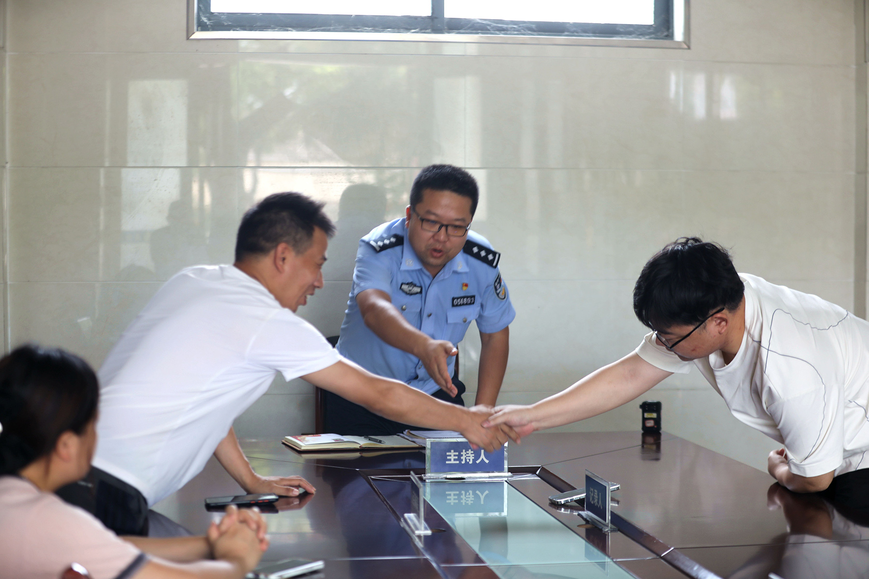 圖三:在民警努力下雙方當(dāng)事人達(dá)成協(xié)議握手言和。