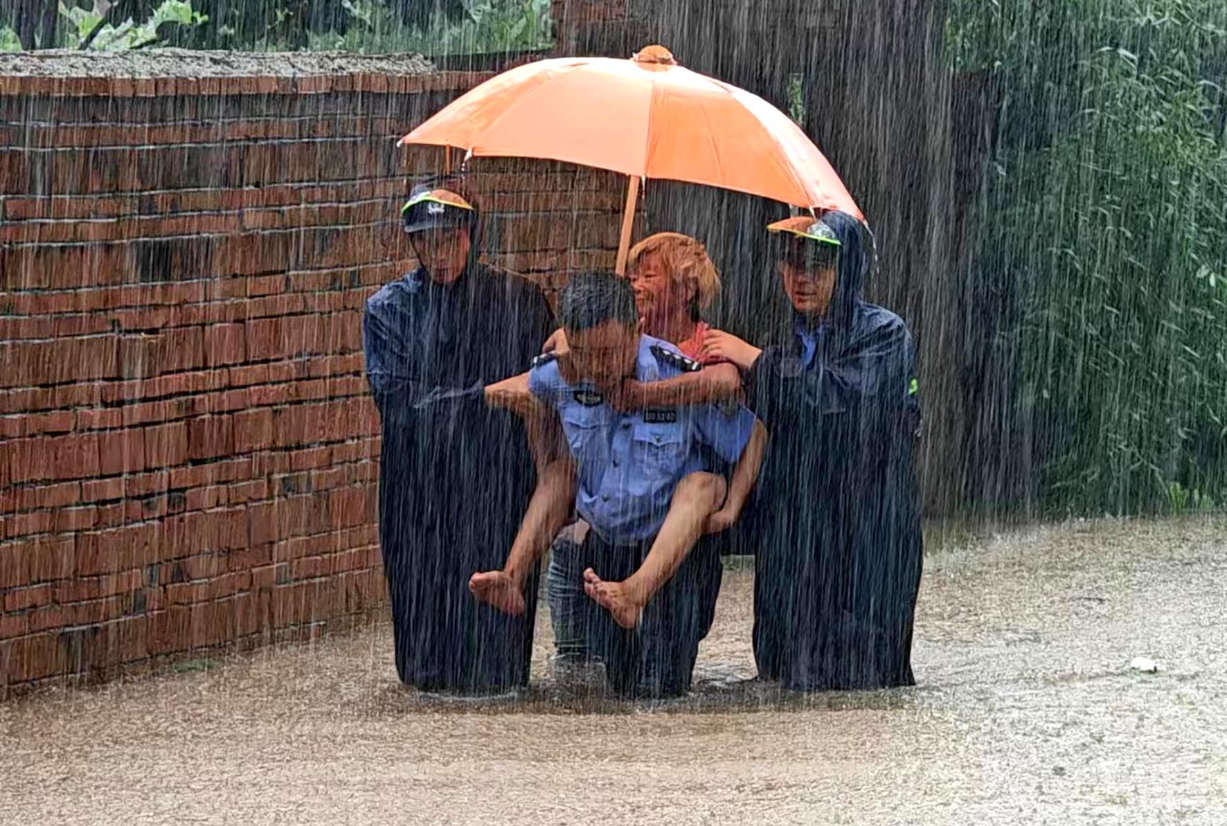 7月17日,安徽省碭山縣朱樓鎮(zhèn)出現(xiàn)強(qiáng)降雨天氣,部分地區(qū)積水嚴(yán)重。碭山縣公安局朱樓派出所民警輔警迅速將受困群眾轉(zhuǎn)移至安全地帶。