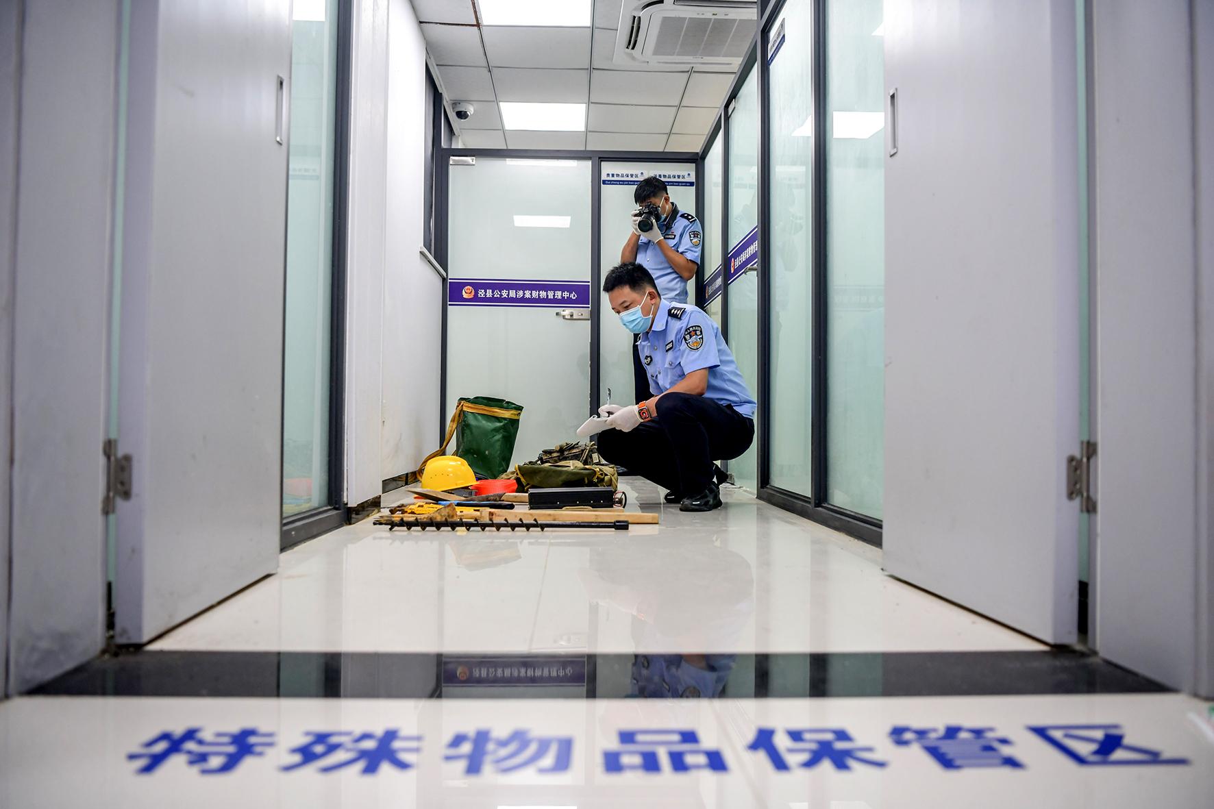圖為辦案民警對(duì)涉案物品進(jìn)行登記入庫(kù)保存。