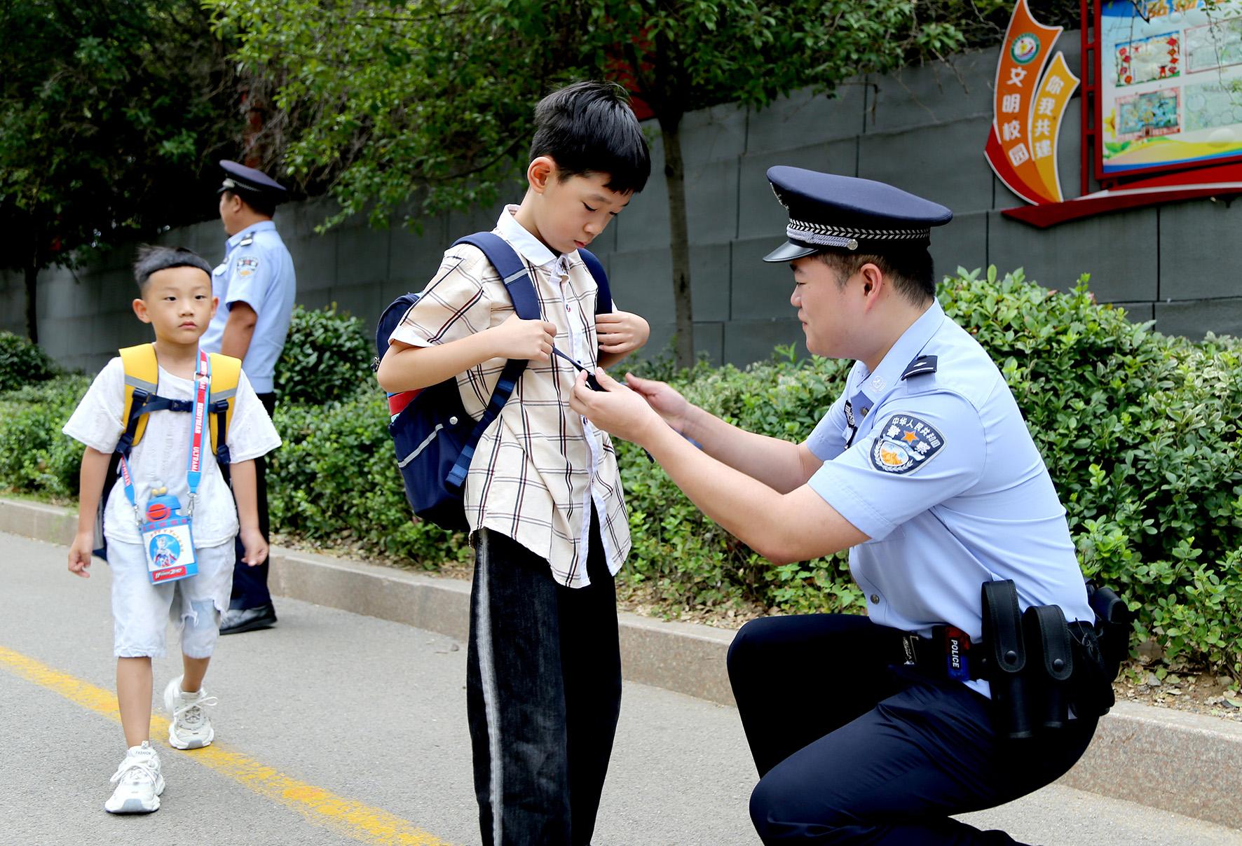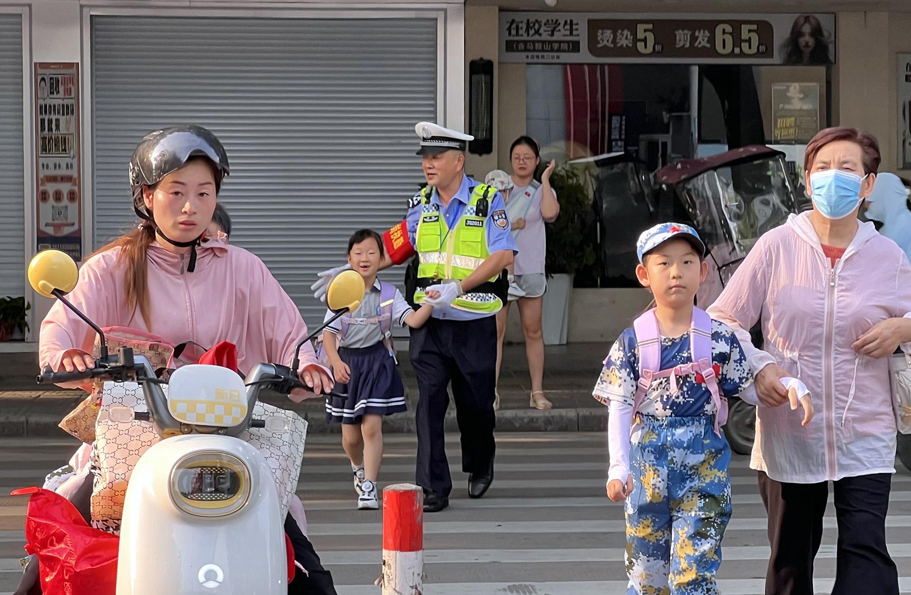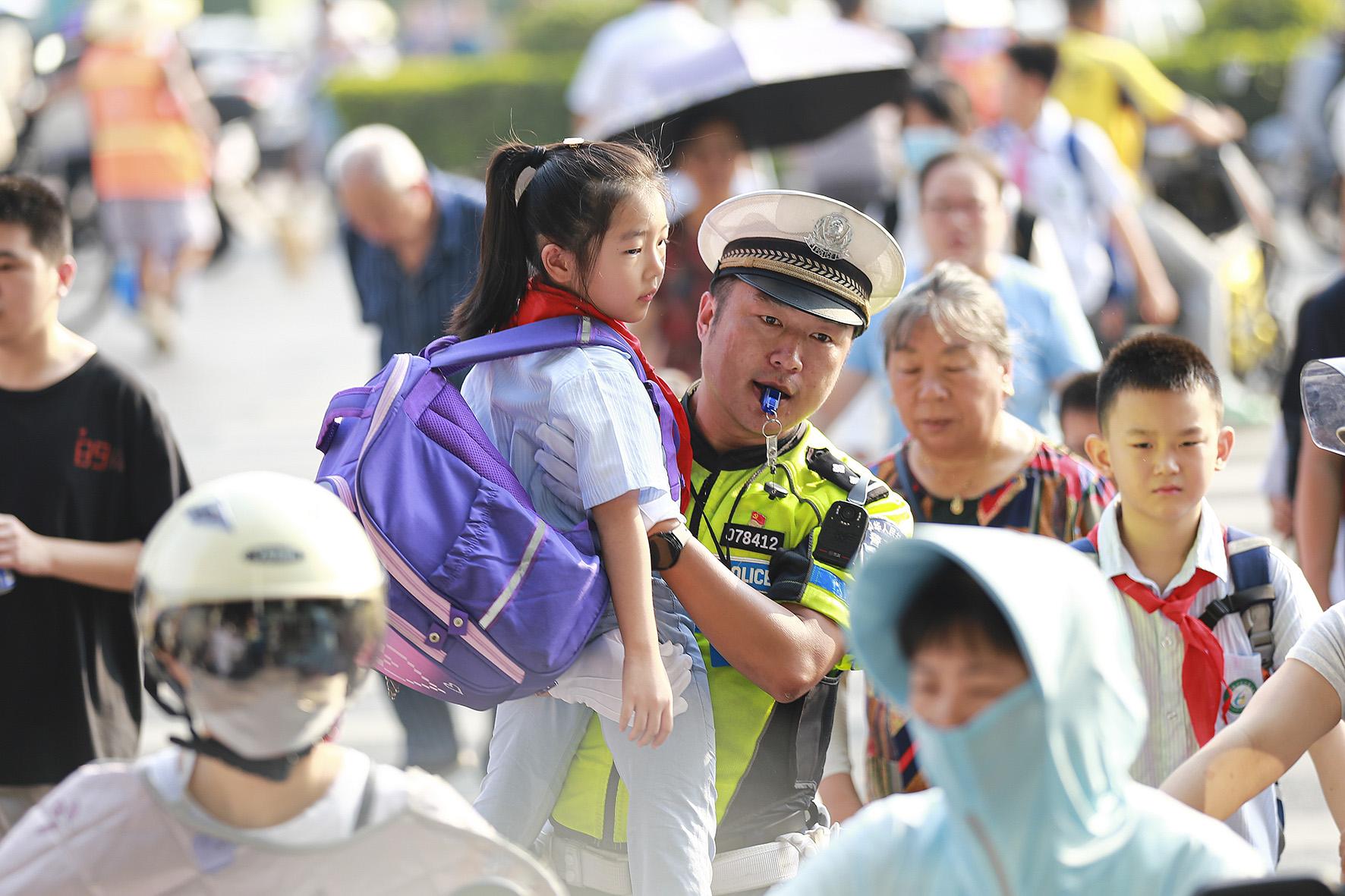 9月2日,安徽省馬鞍山市和縣公安局“校園護(hù)學(xué)崗”民警正在歷陽(yáng)鎮(zhèn)第三小學(xué)護(hù)送學(xué)生安全過(guò)馬路。