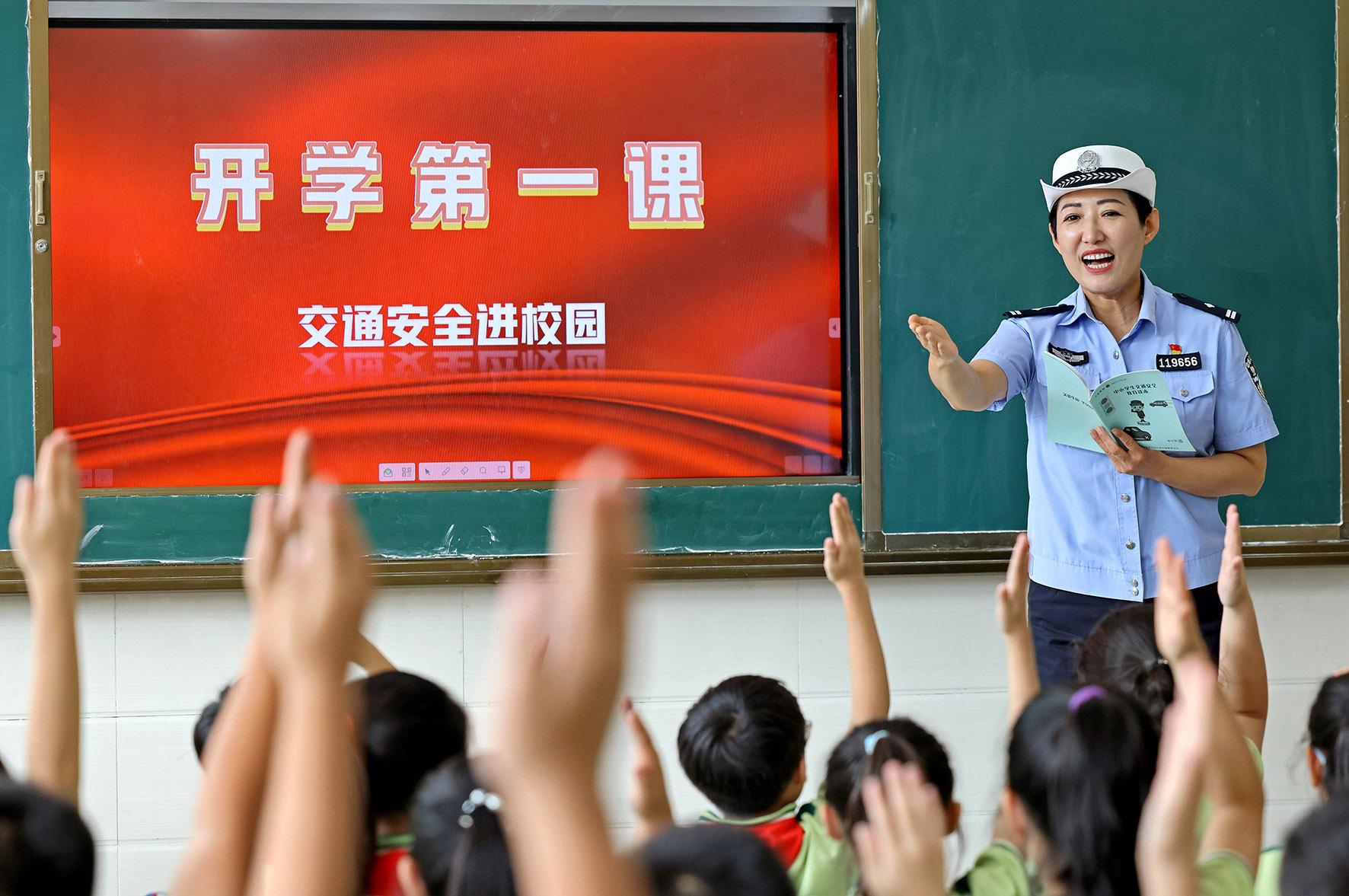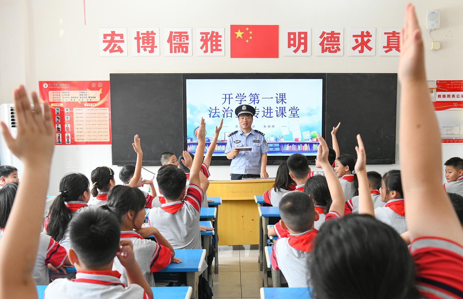 9月2日,安徽省固鎮(zhèn)縣公安局交管大隊(duì)民輔警在第五小學(xué)為學(xué)生上交通安全課。
