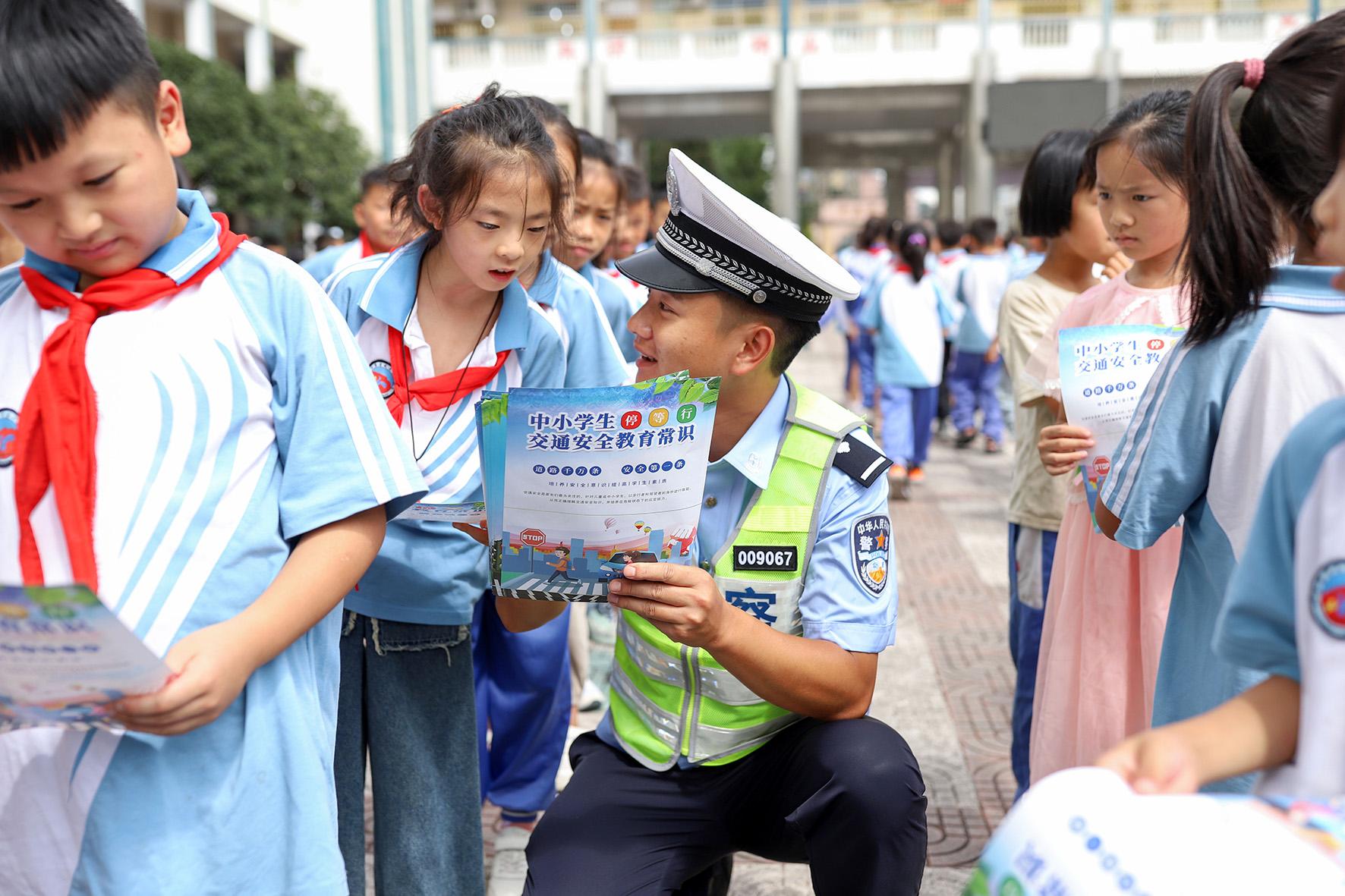 9月2日,貴州省黔東南苗族侗族自治州丹寨縣公安局交警大隊(duì)組織宣傳民警走進(jìn)轄區(qū)中小學(xué)校園,向廣大師生宣傳普及道路交通安全知識(shí)。