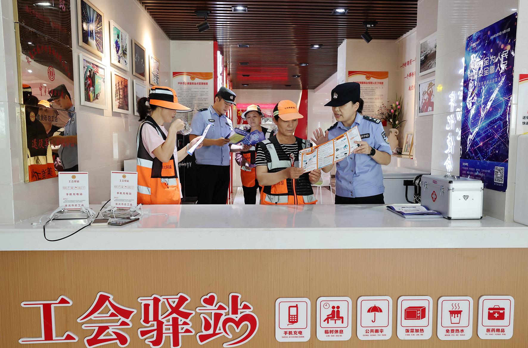 9月4日,安徽省淮北市公安局相山分局三堤口派出所民警在工會(huì)驛站里,向休息的戶外勞動(dòng)者宣傳網(wǎng)絡(luò)安全知識(shí)。