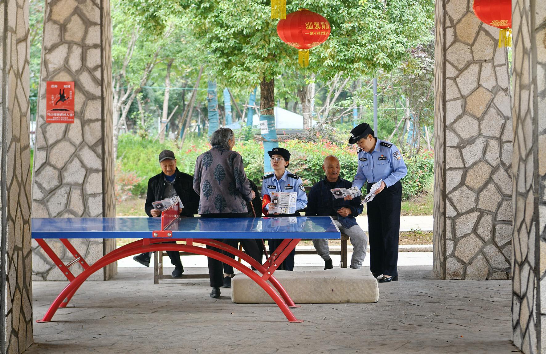 10月10日,安徽省阜南縣公安局治安大隊(duì)民輔警在鹿城鎮(zhèn)白果社區(qū)向居民們宣講防騙知識。