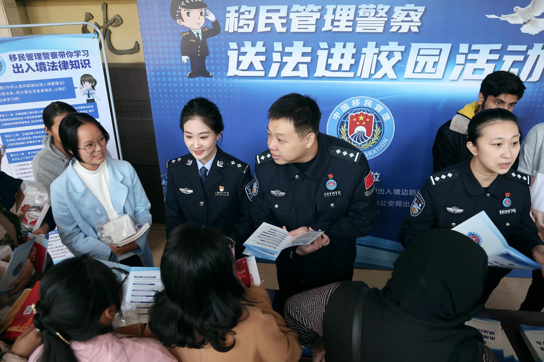 10月11日,遼寧出入境邊防檢查站聯(lián)合遼寧省公安廳出入境管理局、遼寧省司法廳等單位,在沈陽醫(yī)學院開展“移民管理警察送法進校園”活動。