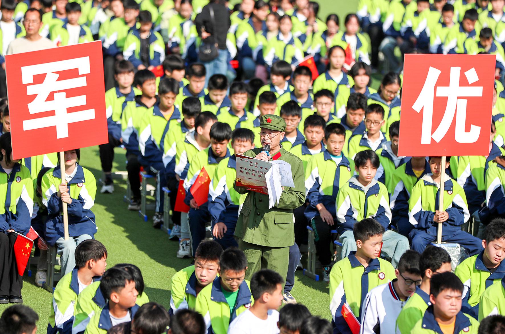 圖為10月15日,在華鎣二中國防教育法宣傳活動現場,戰(zhàn)斗英雄張昌仁向學生們講述自己保家衛(wèi)國的戰(zhàn)斗故事。