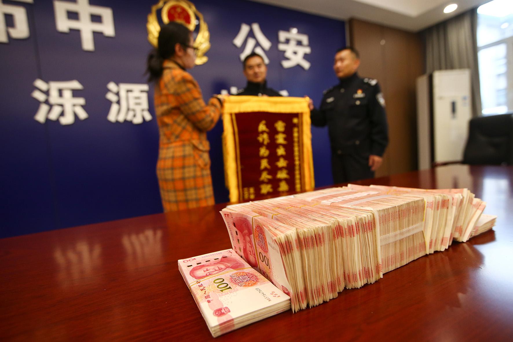 10月21日,在山東省濟(jì)南市公安局市中區(qū)分局濼源派出所,來自安徽的受害人李女士領(lǐng)取了被騙的24萬(wàn)現(xiàn)金。