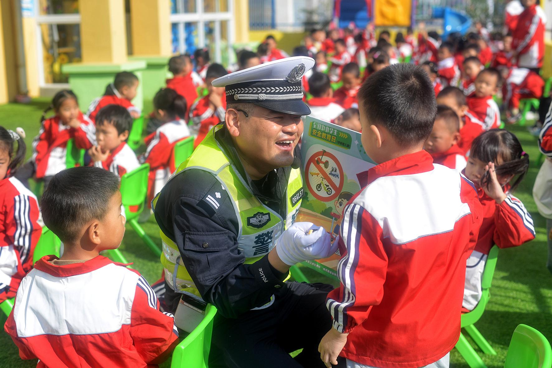 10月23日,安徽省巢湖市公安局交警大隊(duì)民警結(jié)合宣傳圖板,向幼兒園小朋友們講解道路交通安全知識(shí)。