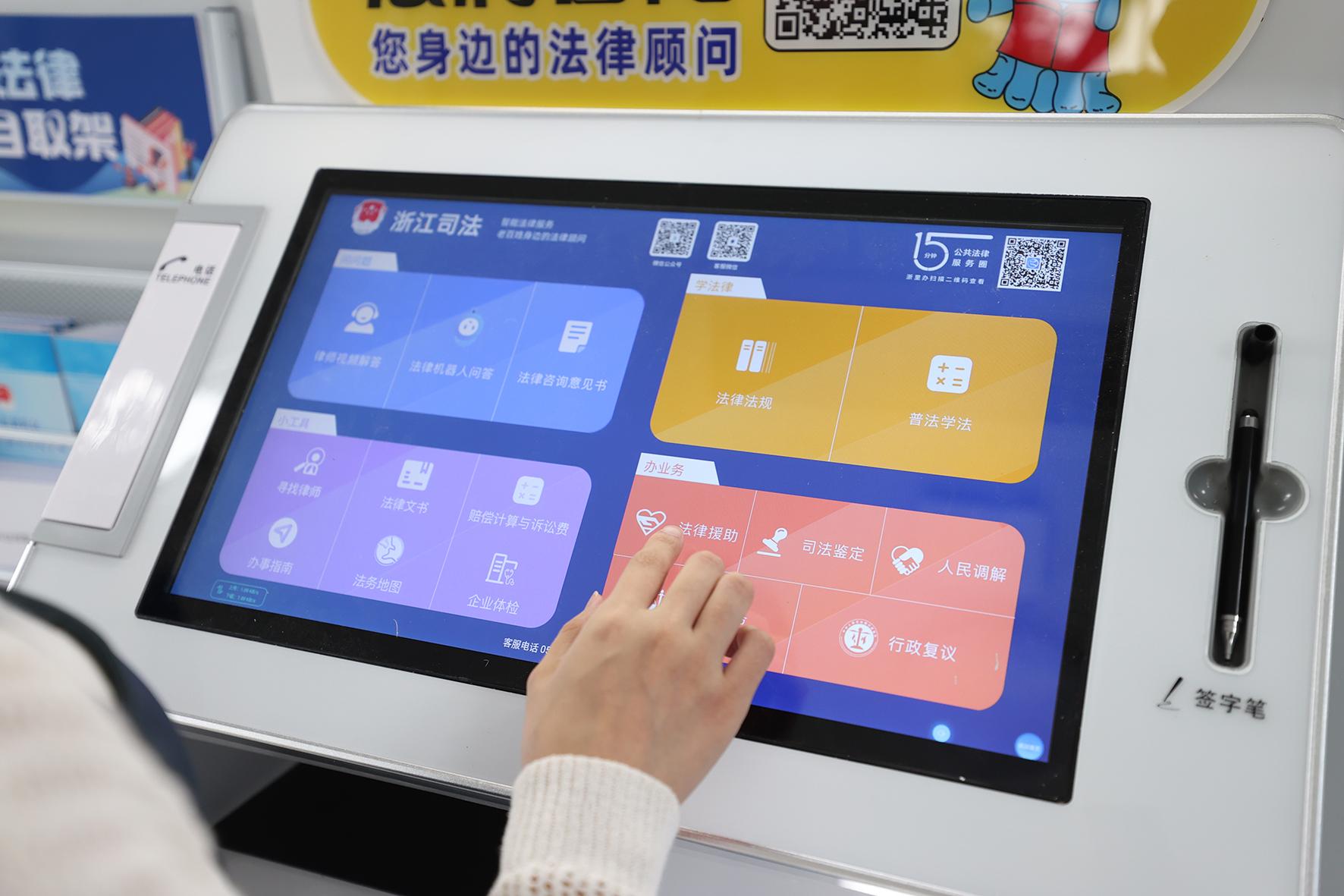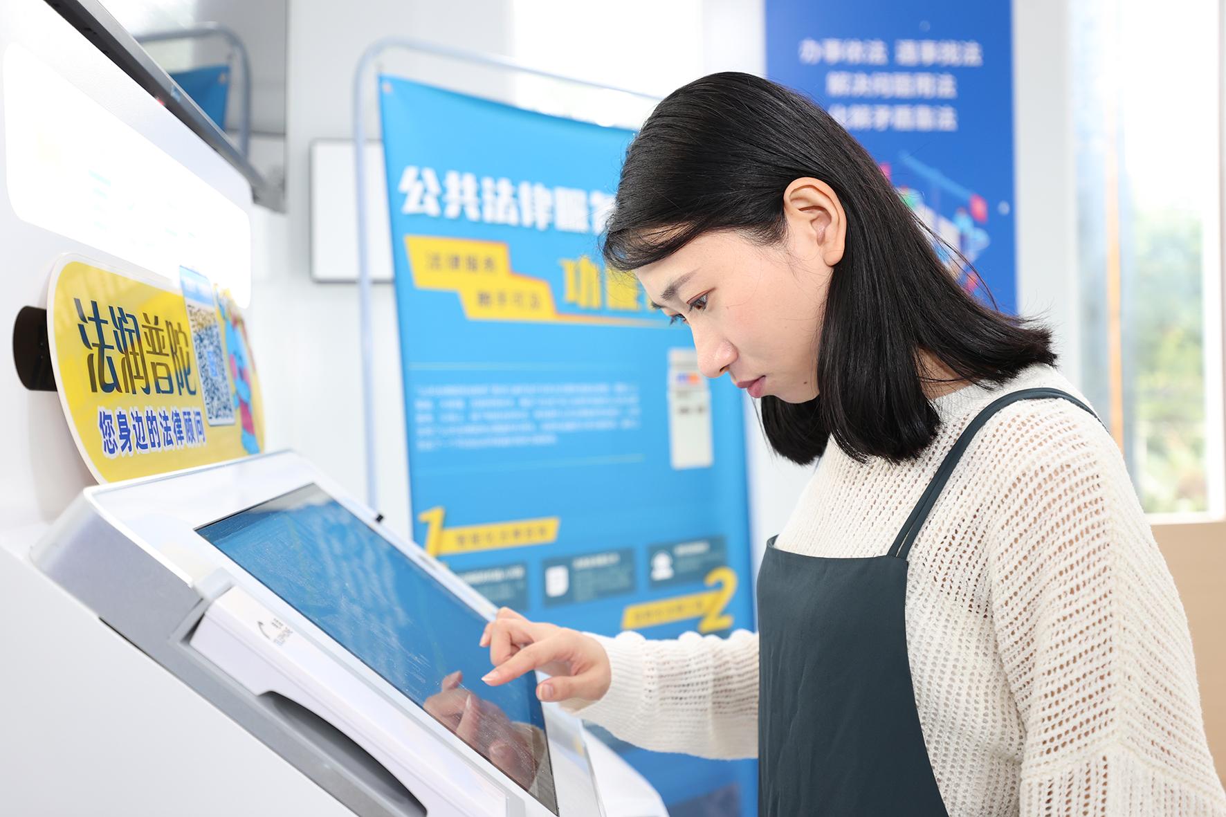 10月28日,浙江省舟山市普陀區(qū)市民正在24小時(shí)法超市內(nèi)使用公共法律服務(wù)自助機(jī)辦理相關(guān)業(yè)務(wù)。