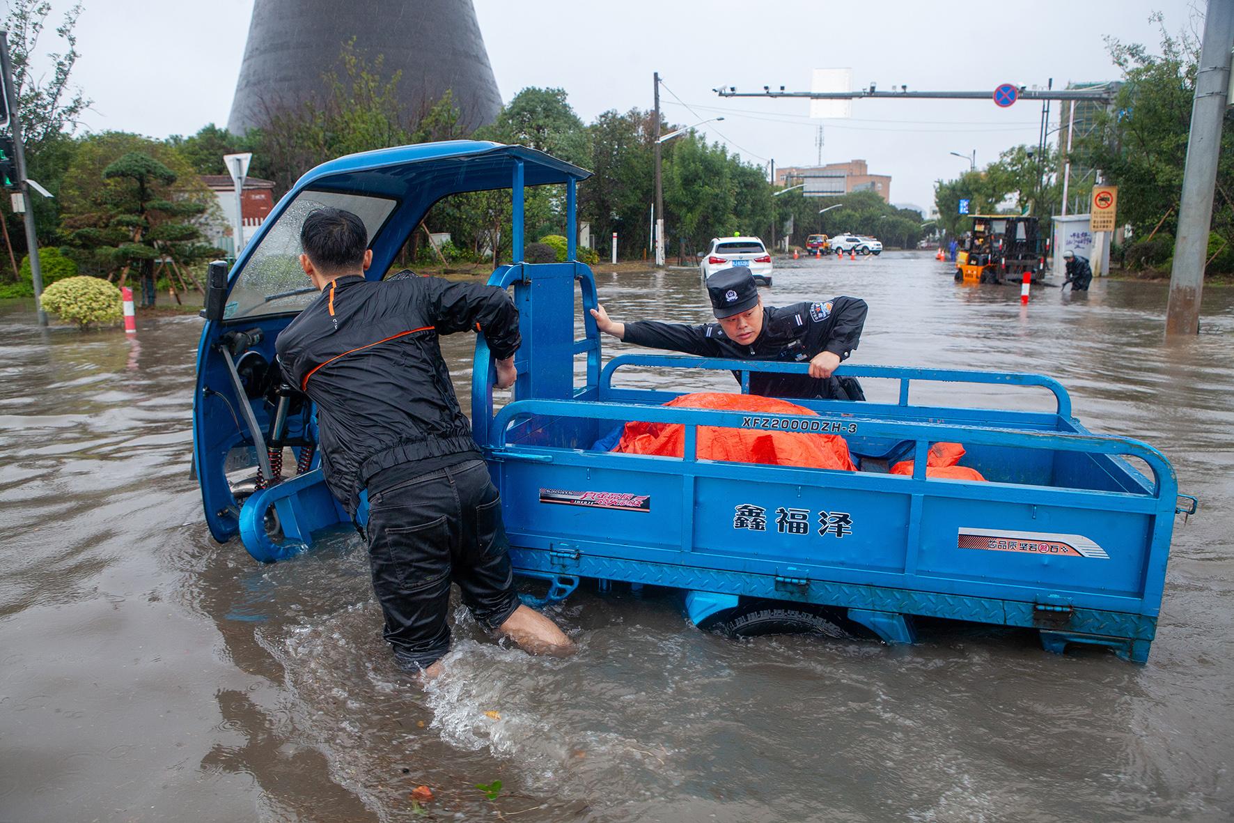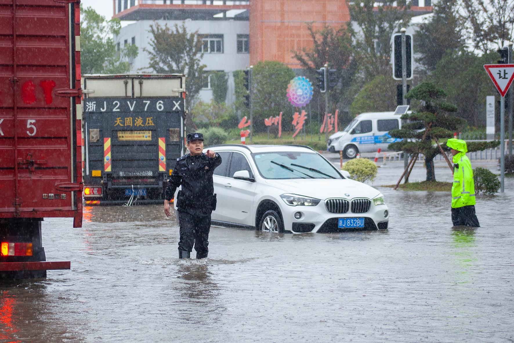 11月1日,臺風(fēng)“康妮”帶來的暴雨使浙江省臺州市黃巖區(qū)部分路段積水嚴(yán)重。臺州市公安局黃巖分局全力應(yīng)對,做好救援車輛、轉(zhuǎn)移群眾工作。