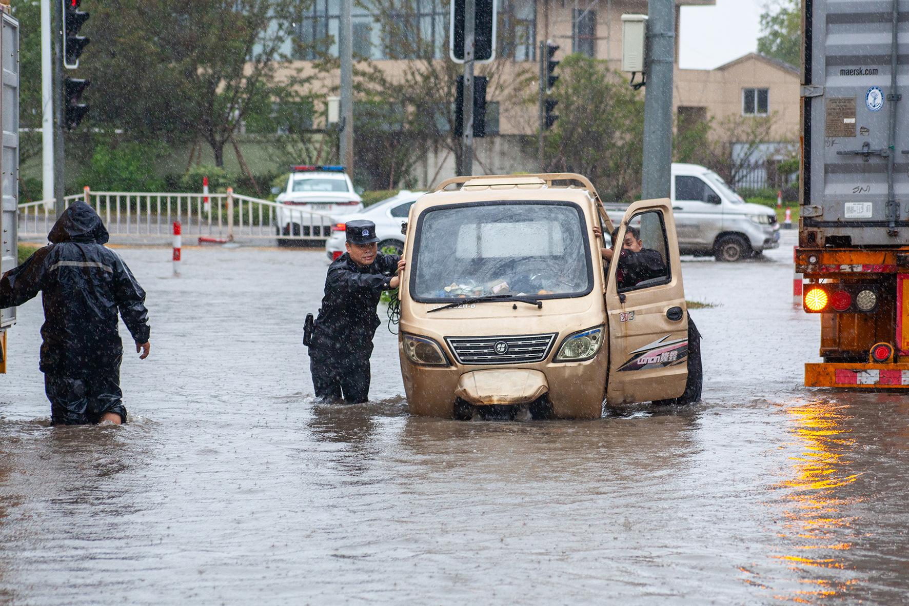 圖為江口派出所民警在雨中救援被困車輛和人員。