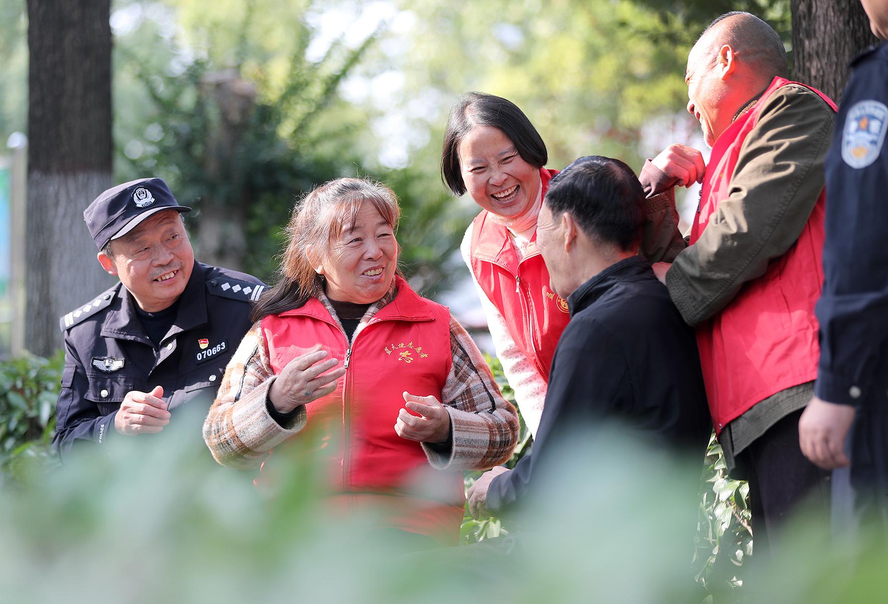圖為11月5日,民警與救助對(duì)象一起在公園向老年人開(kāi)展防范養(yǎng)老詐騙普法宣傳活動(dòng)。
