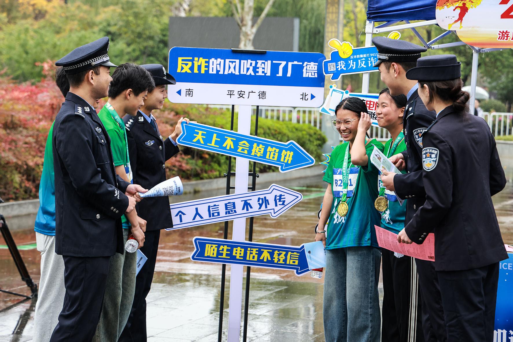 11月17日,安徽省廣德市公安局在馬拉松運(yùn)動(dòng)員完賽區(qū)設(shè)置反詐騙服務(wù)站,開(kāi)展反詐知識(shí)宣傳。