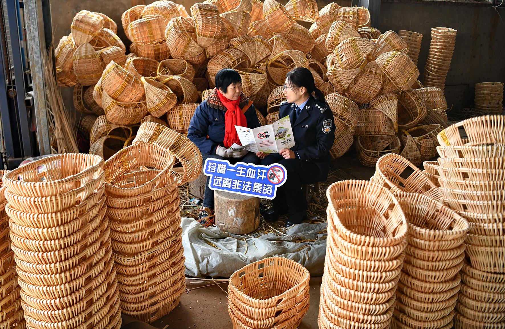 12月11日,安徽省阜南縣公安局郜臺派出所民警在轄區(qū)一柳編企業(yè)向工人宣講防騙知識。阜南縣公安局經(jīng)偵大隊聯(lián)合郜臺派出所開展“冬季送平安 送法進企業(yè)”冬季行動宣傳。