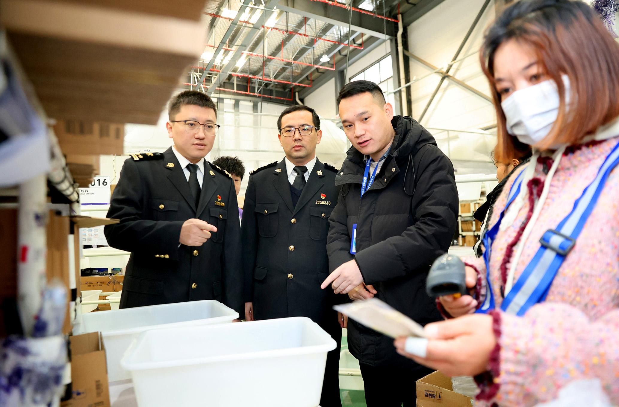 12月12日,在江蘇南通綜合保稅區(qū)燦達公司跨境倉庫,海關(guān)關(guān)員現(xiàn)場查看準(zhǔn)備打包發(fā)運的包裹。