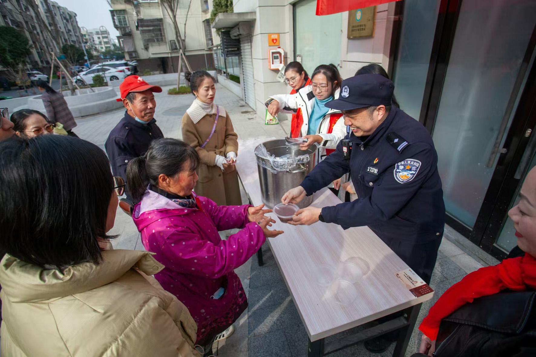 1月7日,浙江省臺州市公安局黃巖分局城東派出所民警和東城街道白楊社區(qū)工作人員一起,在白楊社區(qū)內(nèi)開展分發(fā)八寶粥活動,并進行安全防范宣傳。