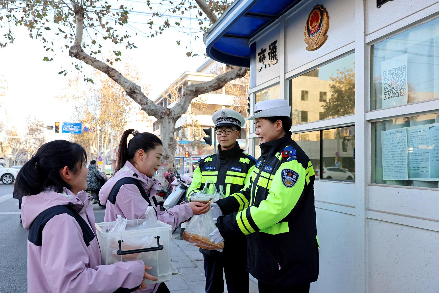 1月7日,山東省棗莊市市中區(qū)文化路絲雨幼兒園老師向崗?fù)ぶ蛋嗟慕煌ㄝo警送上臘八粥。