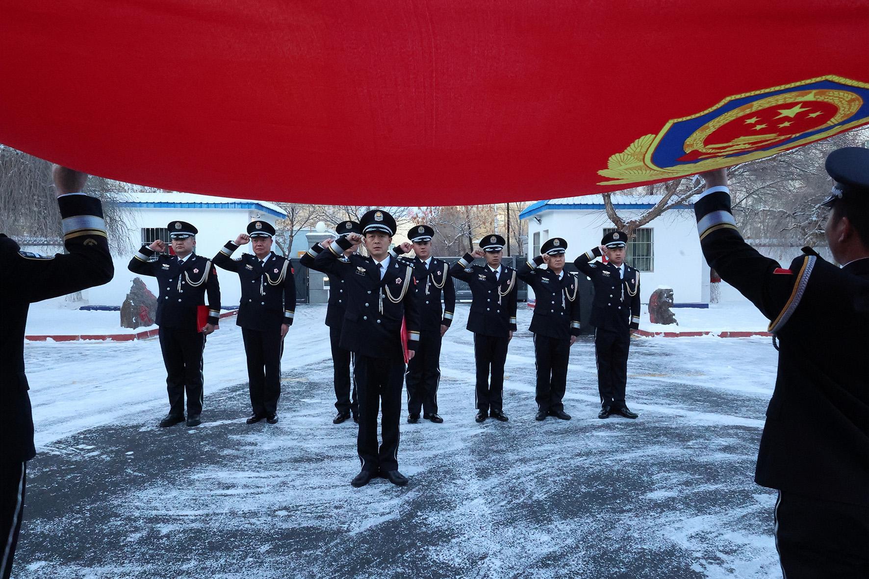 1月10日,新疆阿勒泰吉木乃邊境管理大隊(duì)舉行中國(guó)人民警察節(jié)升旗及宣誓儀式。