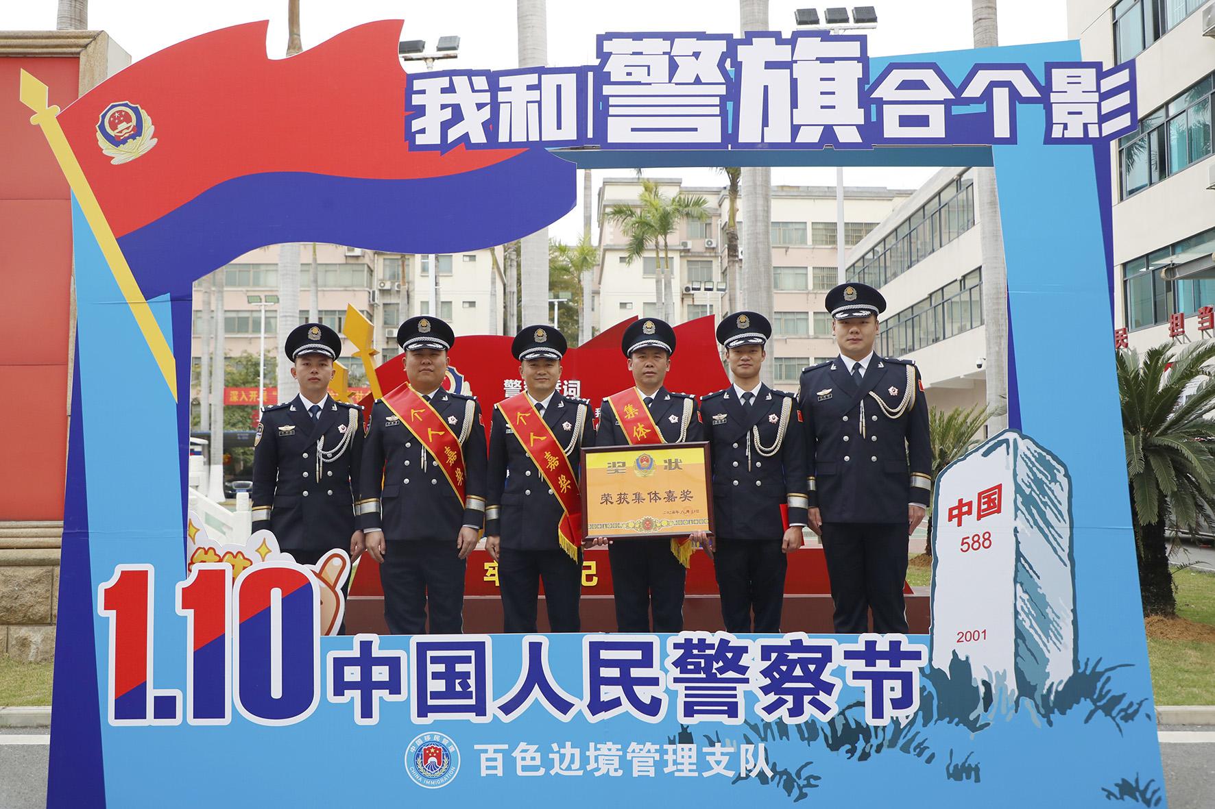 1月10日,廣西百色邊境管理支隊(duì)舉行警察節(jié)榮譽(yù)儀式,為立功受獎(jiǎng)的3個(gè)集體、18名民警、晉升警銜的46名民警代表頒發(fā)獎(jiǎng)?wù)隆⒆C書。