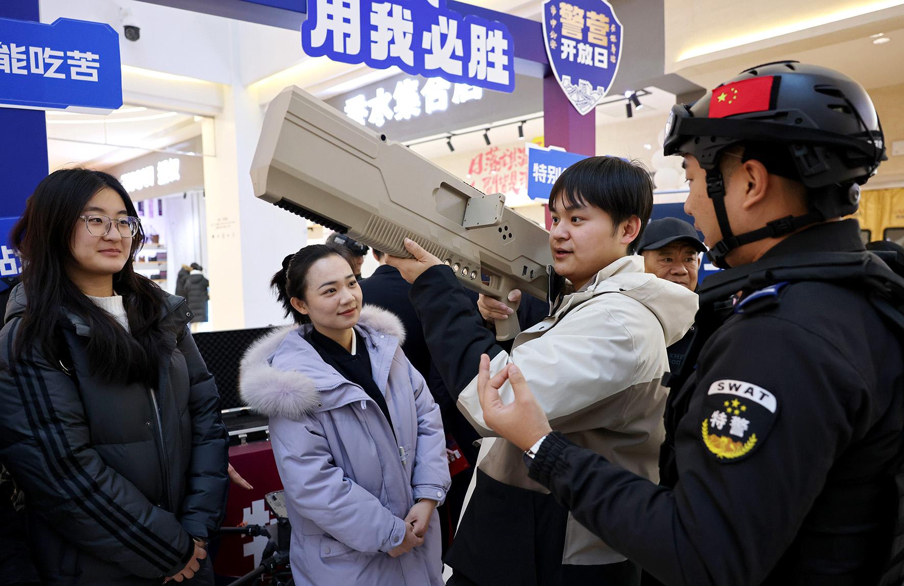 1月10日,第五個(gè)中國(guó)人民警察節(jié)。山東省棗莊市公安局警營(yíng)開(kāi)放日活動(dòng)現(xiàn)場(chǎng),市民在體驗(yàn)警用裝備。