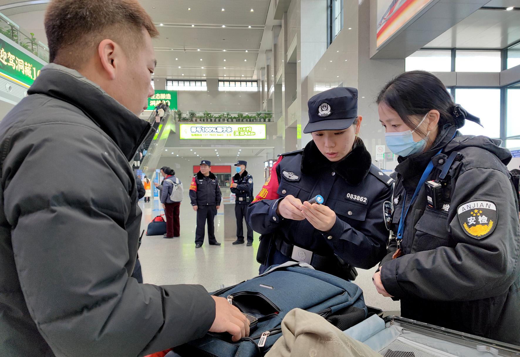 1月14日,春運(yùn)首日,合肥鐵路公安處六安站派出所民警對(duì)乘客攜帶的疑似違禁物品進(jìn)行仔細(xì)檢查。