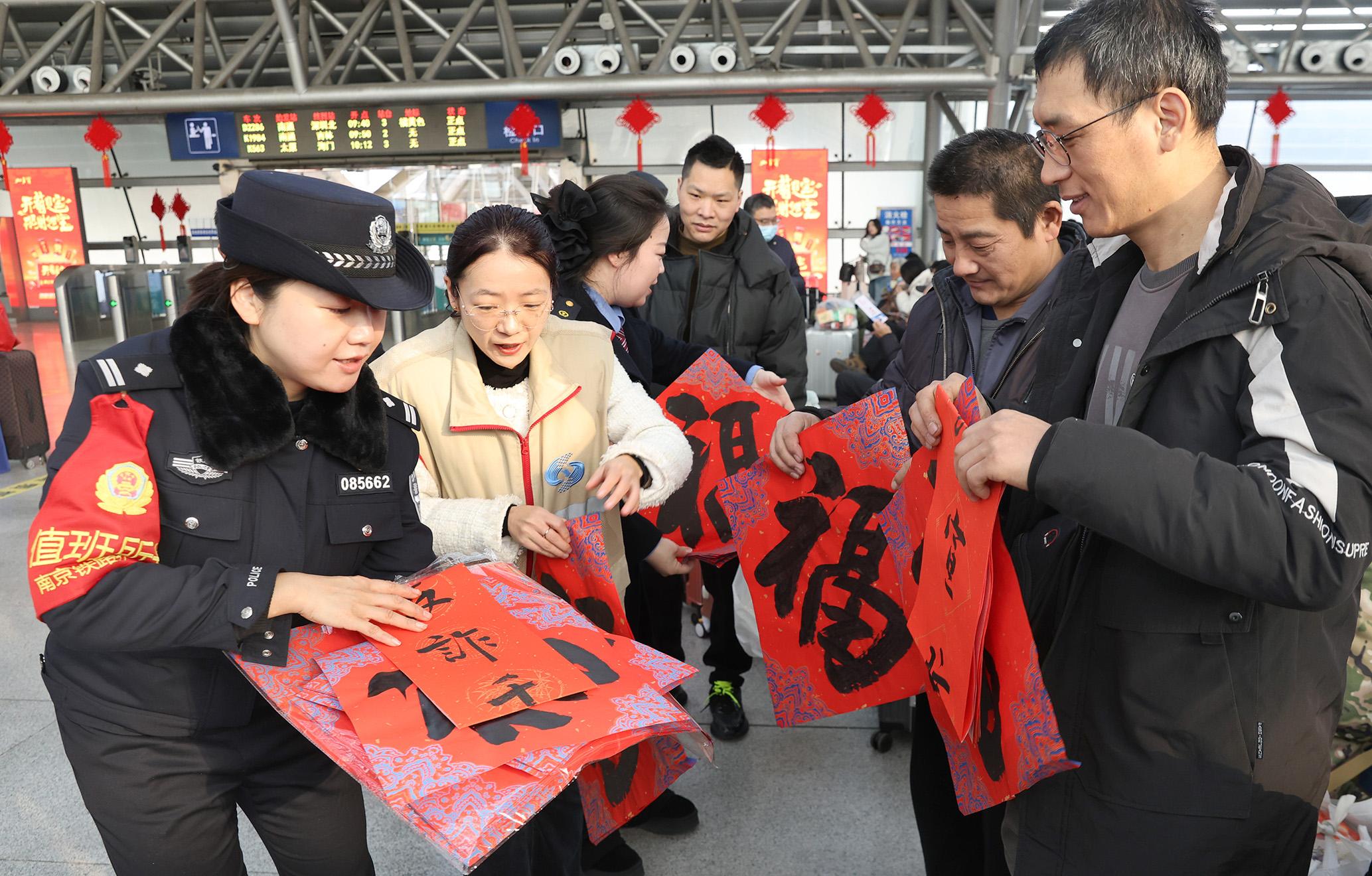 1月14日,春運(yùn)首日。南京鐵路公安處南通站派出所、南通市公安局公交分局站前派出所聯(lián)合幸福街道開(kāi)展情暖春運(yùn)活動(dòng)。