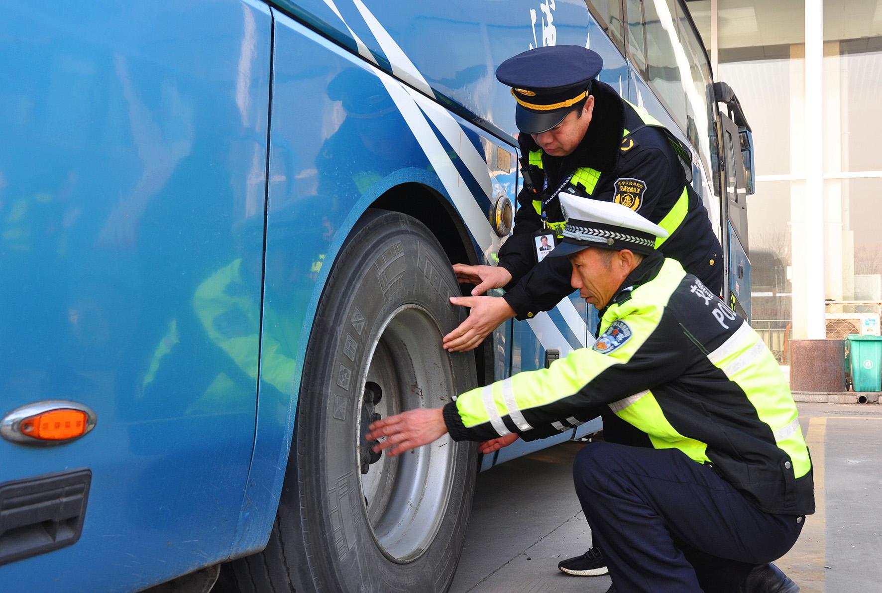 1月14日,安徽省阜南縣公安局交管大隊(duì)民警在客運(yùn)站檢查客運(yùn)車(chē)輛安全設(shè)施。