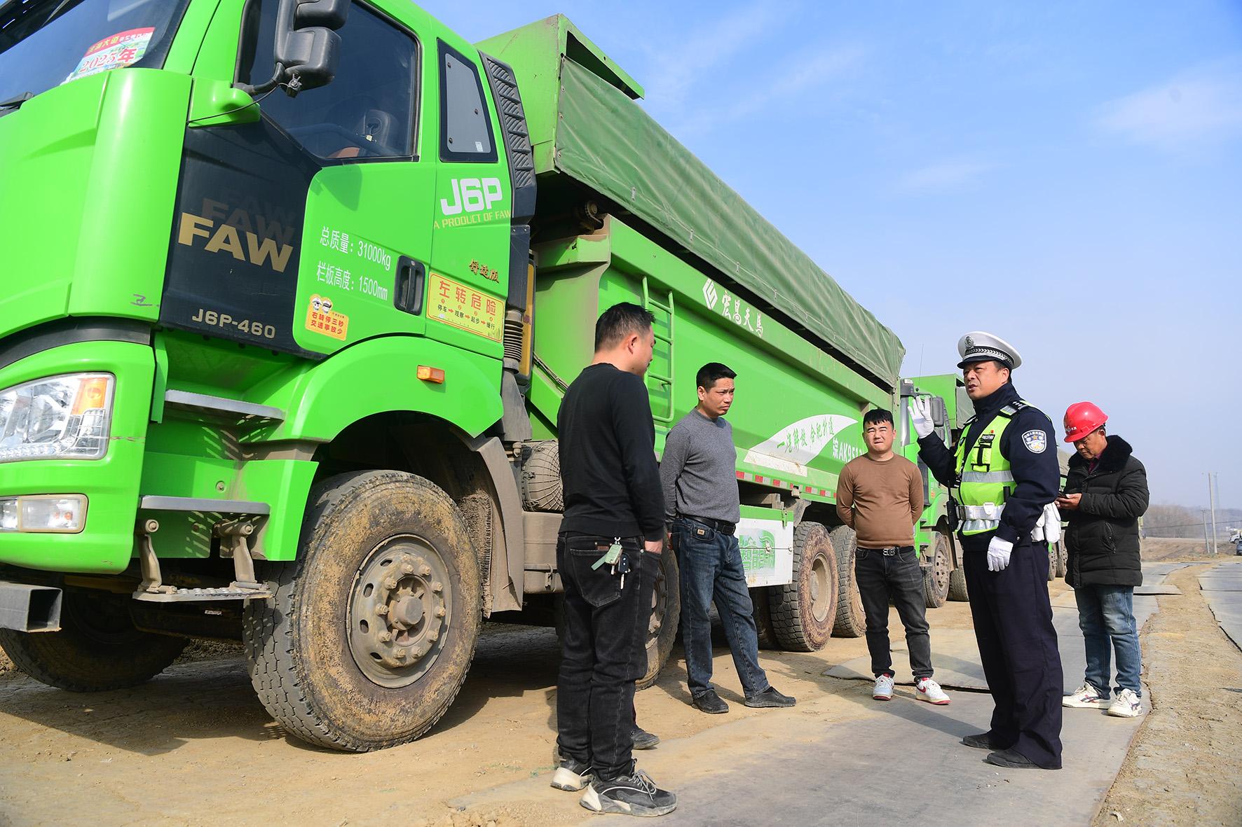 1月14日,安徽省巢湖市公安局交警大隊(duì)民警在運(yùn)送石料場(chǎng)地開(kāi)展對(duì)大貨車(chē)駕駛員的交通安全宣傳。
