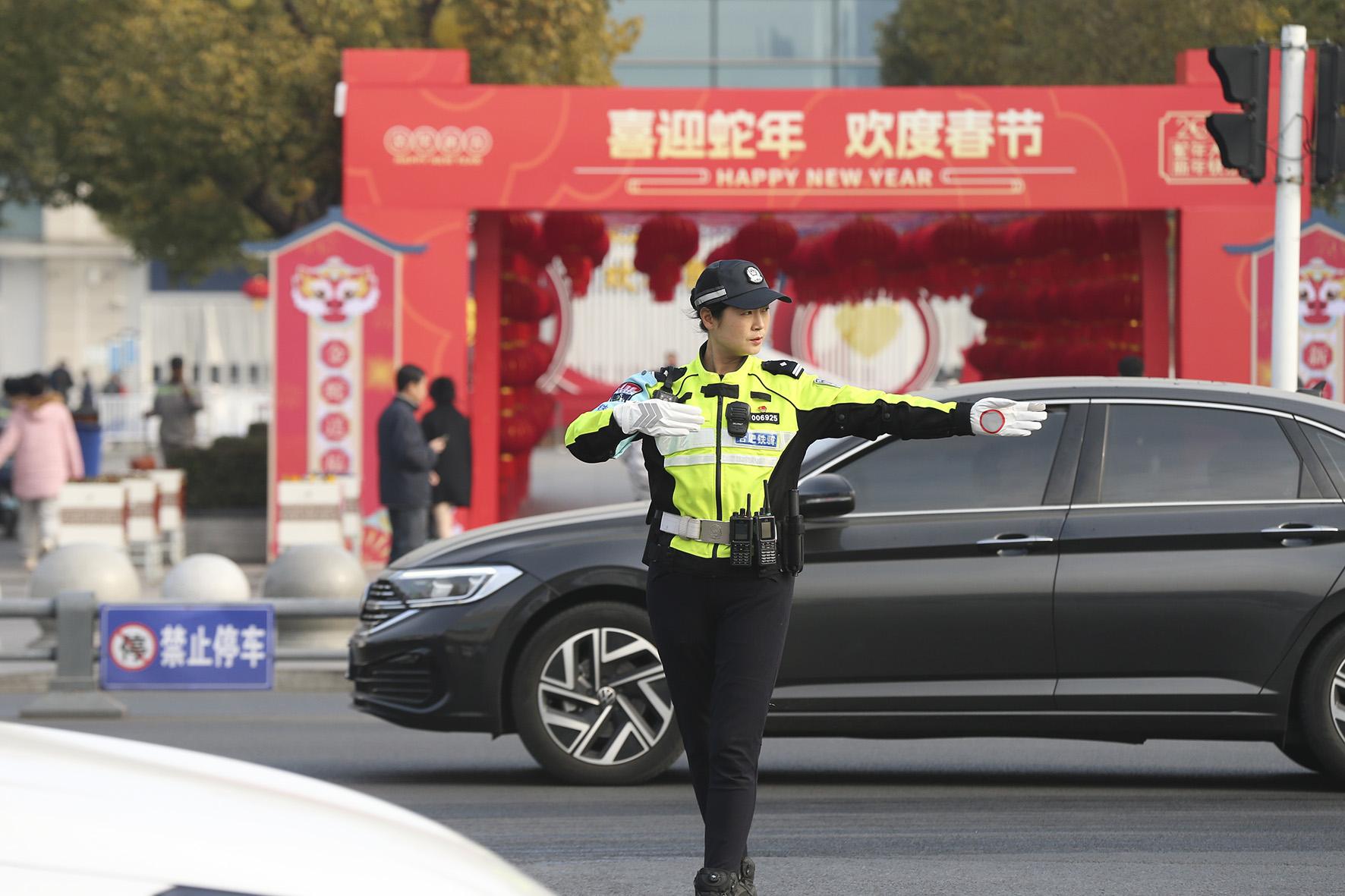 1月14日,安徽省合肥市公安局交警支隊(duì)女子鐵騎隊(duì)員在合肥站附近執(zhí)勤,指揮疏導(dǎo)交通。