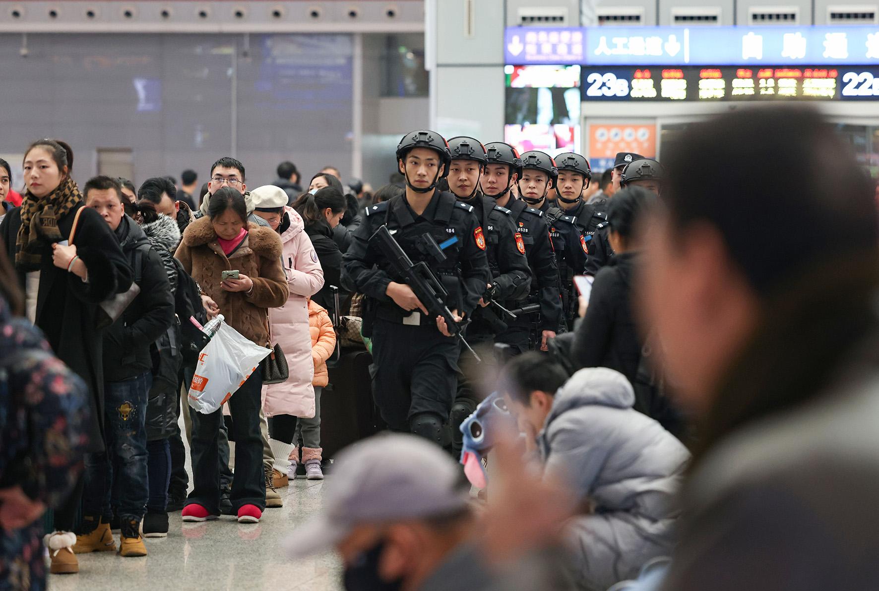 1月14日,成都鐵路公安局貴陽(yáng)公安處組織民警在貴陽(yáng)北站開(kāi)展執(zhí)勤巡邏和秩序疏導(dǎo),熱情為旅客服務(wù),守護(hù)春運(yùn)旅客平安出行。
