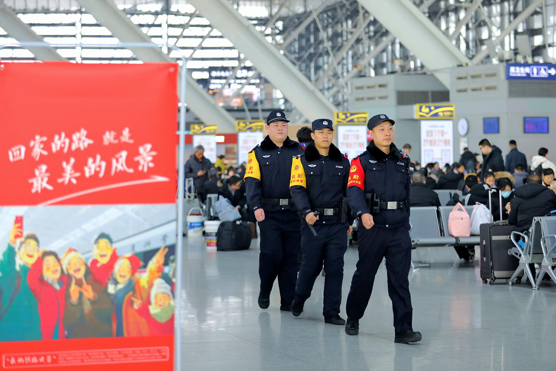 1月14日,在山東省青島火車(chē)北站,青島北站派出所民輔警在候車(chē)室執(zhí)勤巡邏、發(fā)放宣傳頁(yè),守護(hù)旅客出行安全。