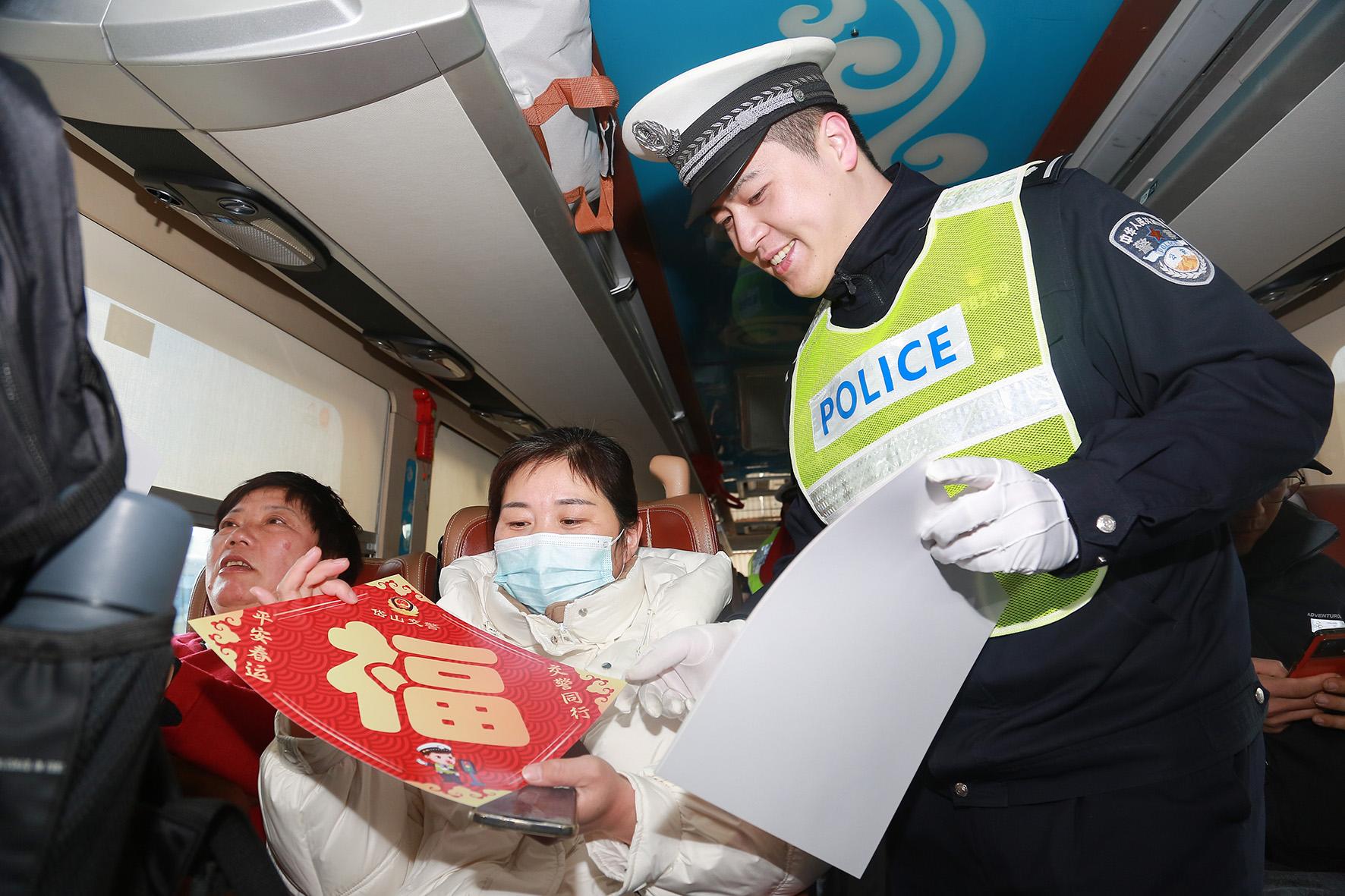 1月14日,安徽省馬鞍山市含山縣公安局交管大隊(duì)在長(zhǎng)途汽車(chē)站開(kāi)展“平安春運(yùn) 交警同行”春運(yùn)啟動(dòng)日活動(dòng)。