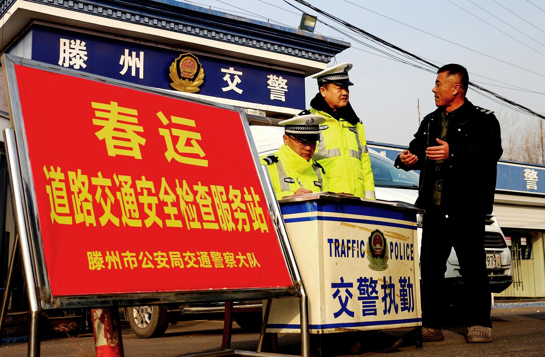 1月14日,山東省滕州市公安局交警大隊(duì)在京臺(tái)高速滕州北出口設(shè)置“春運(yùn)檢查點(diǎn)”,開(kāi)展車(chē)輛安全檢查和交通安全宣傳。