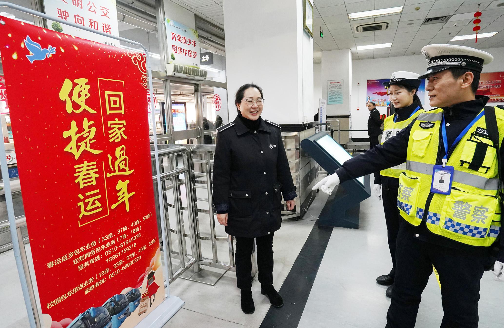 1月14日,春運(yùn)第一天。江蘇省宜興市公安局交警大隊(duì)按照上級(jí)統(tǒng)一部署,組織民警深入轄區(qū)客運(yùn)站、高速公路執(zhí)勤點(diǎn)、高鐵站廣場(chǎng)等地,查看安全設(shè)施,確保旅客歸鄉(xiāng)之路安全暢通。